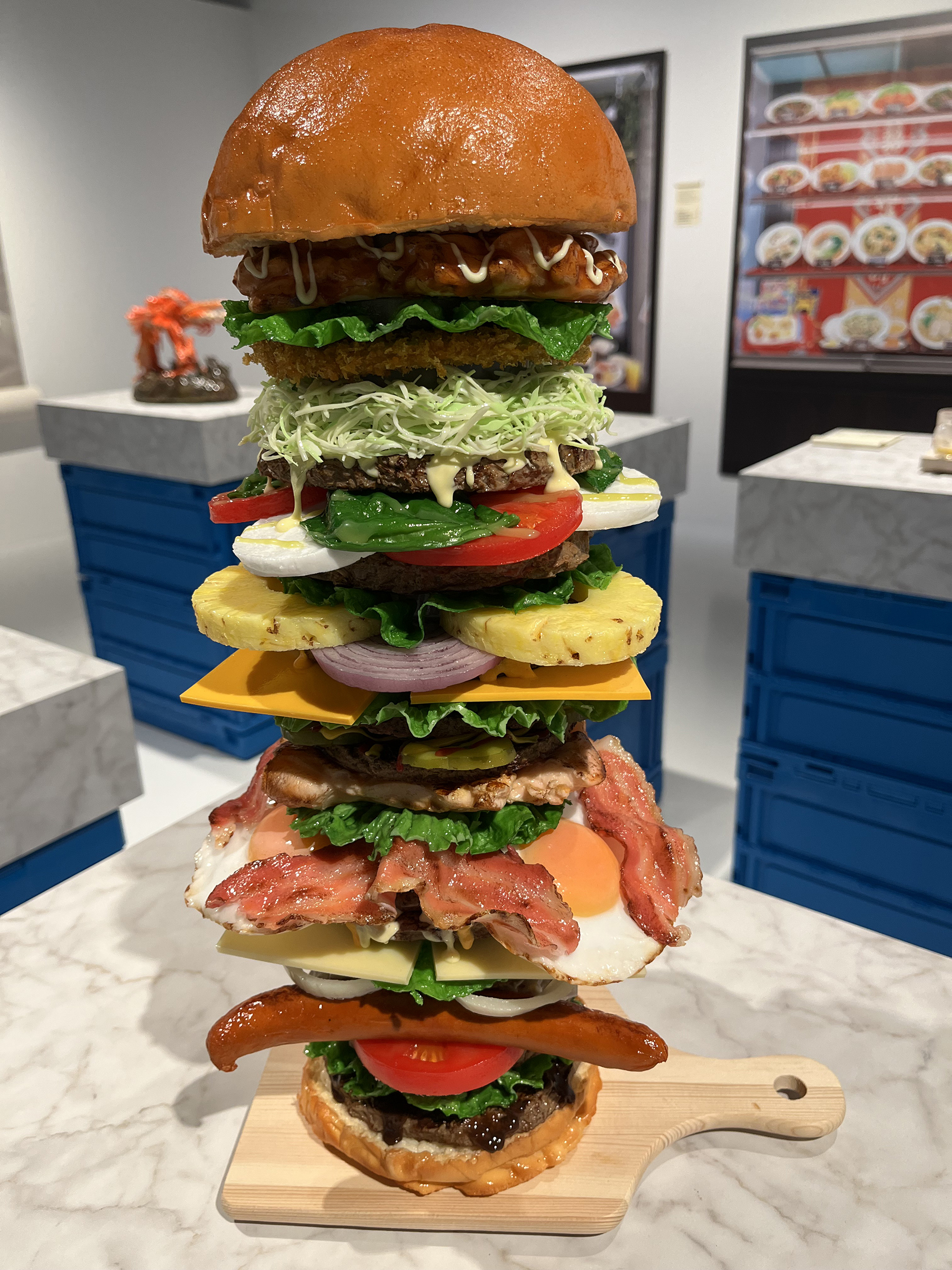 Alongside making accurate replicas, the craftspeople at The Iwasaki Group hold in-house competitions elevating their artistry to create hyper-realistic, witty and fun art pieces. The winners from some of these competitions are displayed and include a drunken crab slurping from a glass of beer, an English breakfast mid-consumption (including a floating cheese on toast) and a giant burger stack which looks like it has been lifted from a Scooby Doo cartoon.