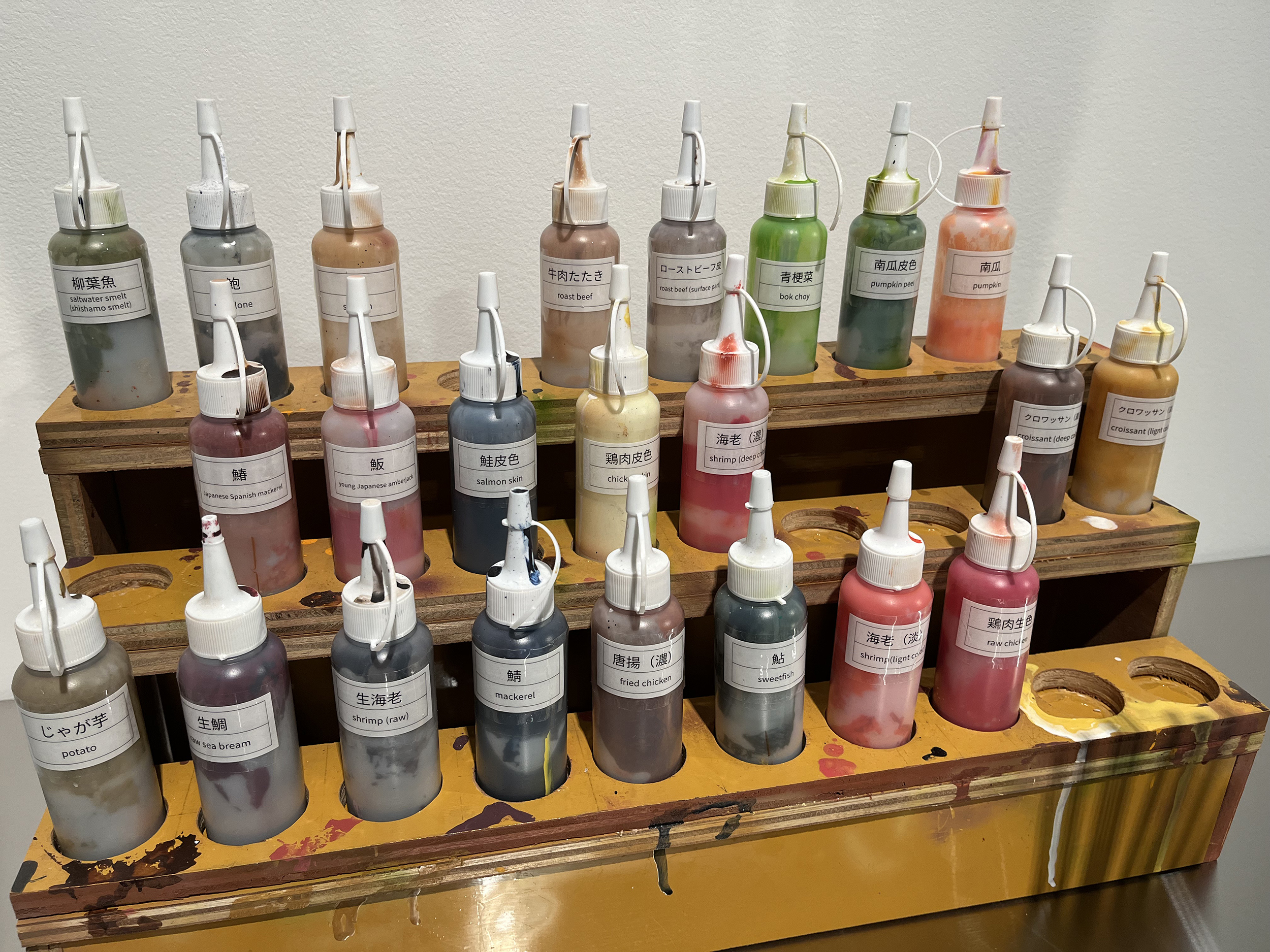 Food replicas are made from PVC which has been cast from silicone moulds and, although the materials have been updated, (they used to make moulds with agar and cast in wax) the process is still pretty much the same. The hardened model is hand-painted by skilled artists who use airbrushes, stencils and paintbrushes to add fine detail. This detailed process is documented stage by stage from casting to colouring. The array of colours reads like a Farrow and Ball catalogue with tones of ‘roast beef’, ‘croissant’ and ‘mackerel’ marked on the labels. The challenge for the craftspeople is to not only produce a realistic replica but recreate people’s expectations and memories of food at its freshest and most appetising moment. A delightful animation by Yamamoto Hikaru shows the process of making prawn tempura and lettuce replicas.