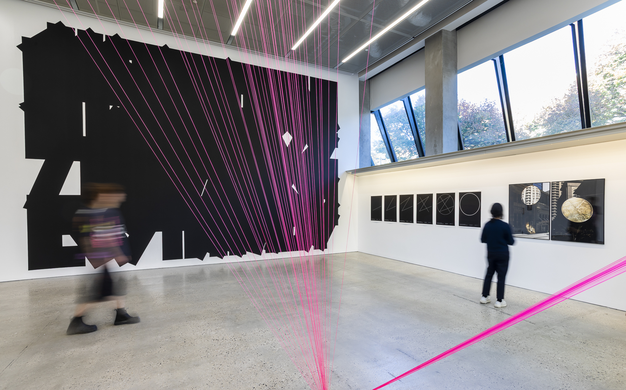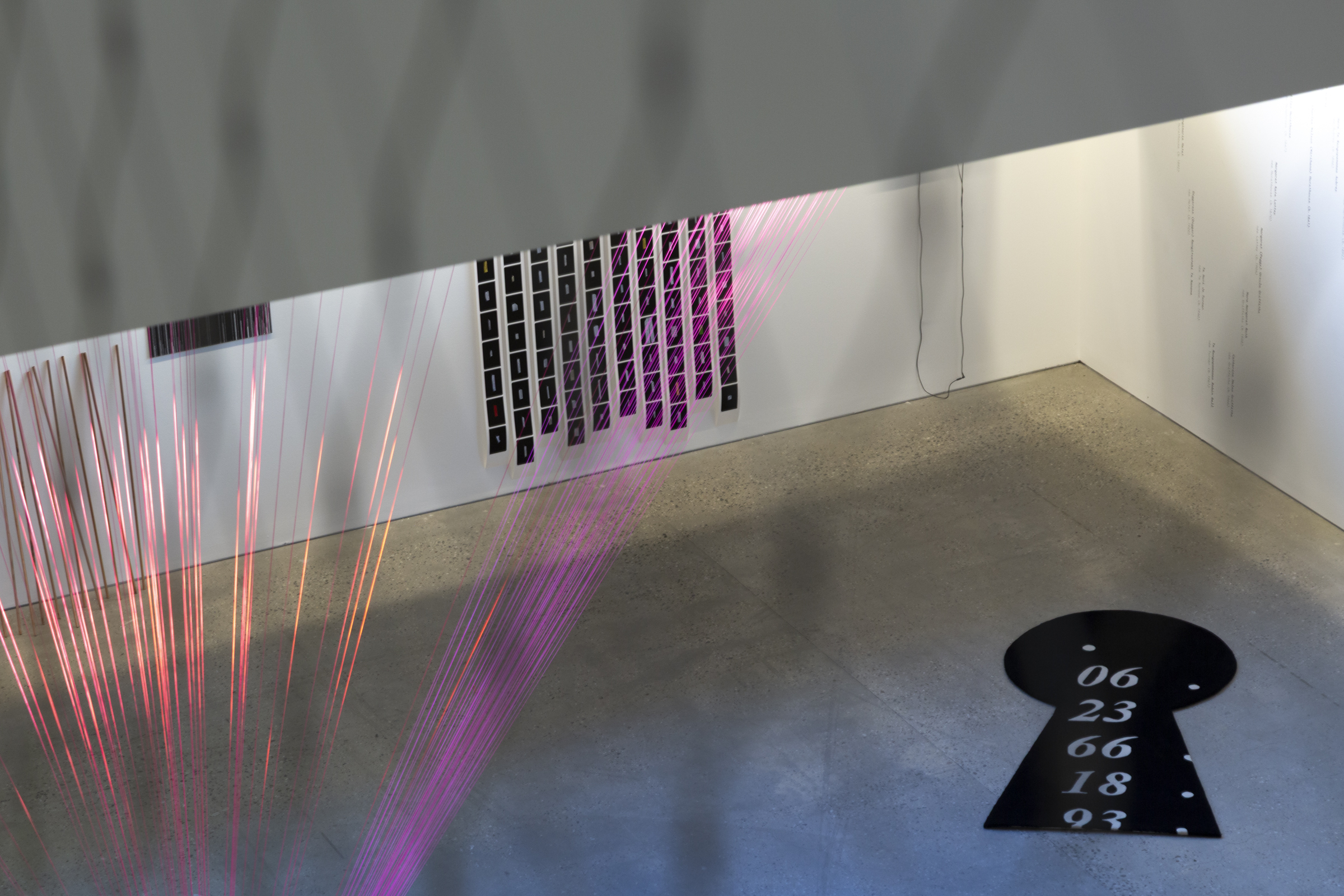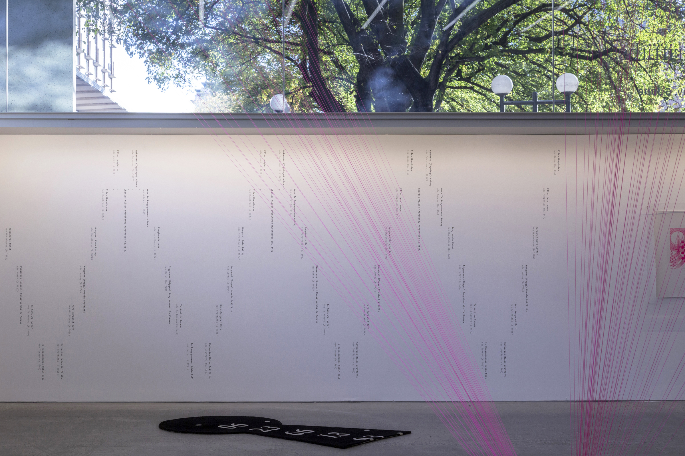 Griffiths’ text work A whakapapa, two lines of women. In the foreground, Out of Line (2025), nylon builder’s line. On the floor, Club de Conversation Keyhole #5, l’Inconnu (2012) a hand-tufted wool rug. Photo: Ingrid Rhule.