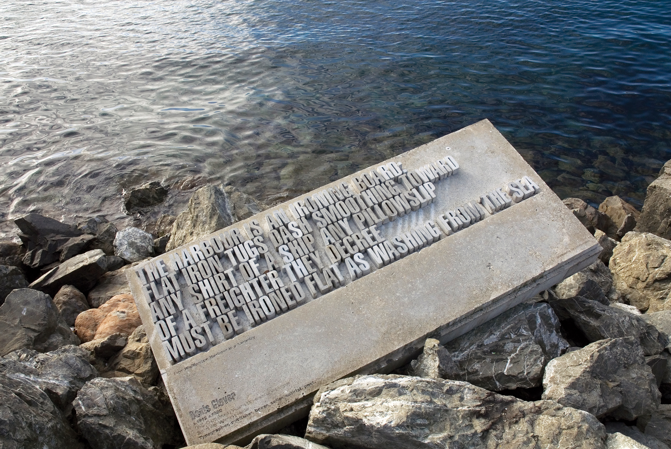 Right. For the Wellington Writers’ Walk (2002-04), Griffiths created three-dimensional type, here an excerpt from a Denis Glover poem, for a series of sculptures along the city’s waterfront. Photograph: Bruce Connew.