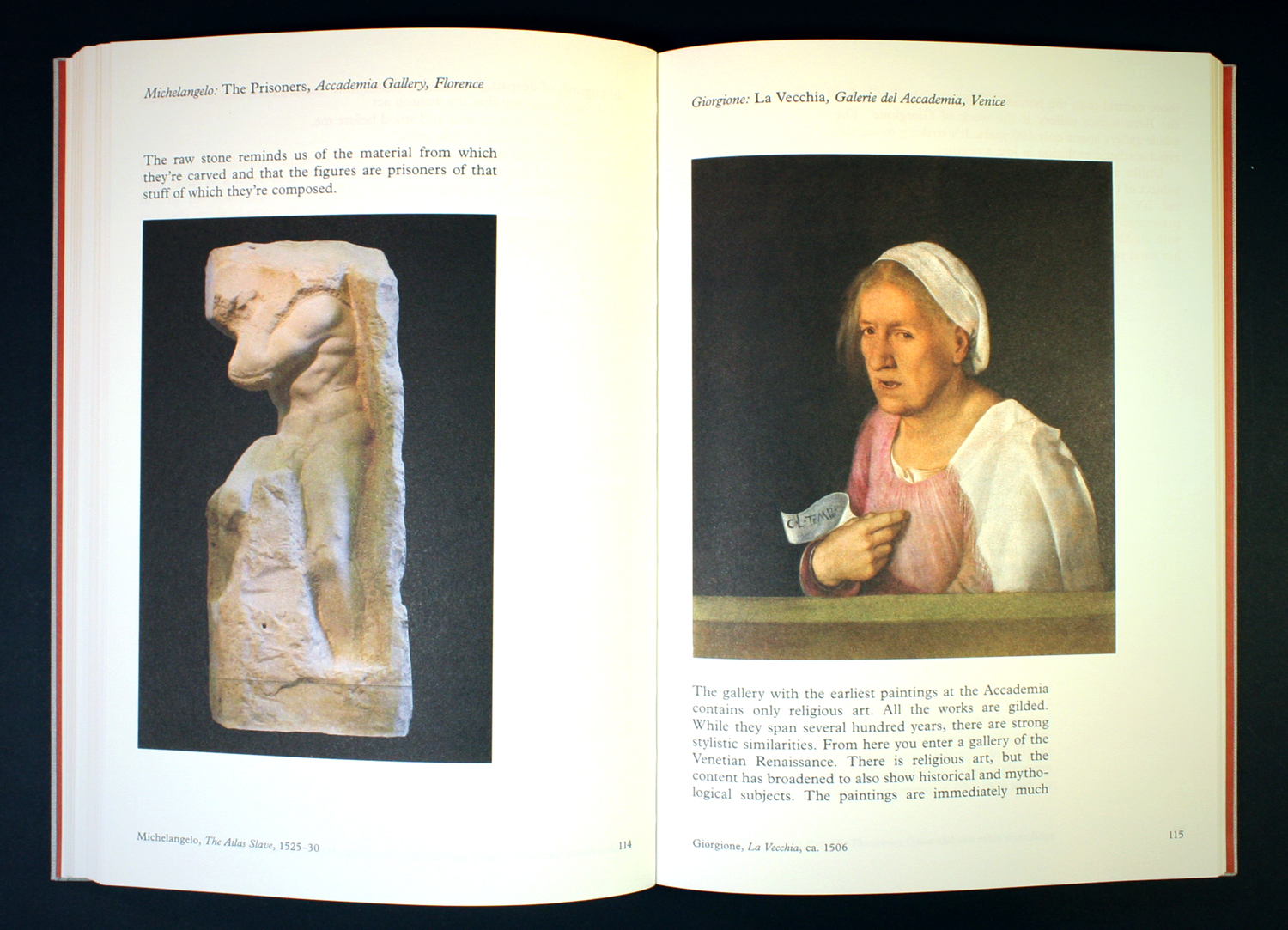 Spread featuring The Prisoners by Michelangelo (left) and La Vecchia by Giorgione (right) in the ‘Influences and Inspirations’ chapter of the book.