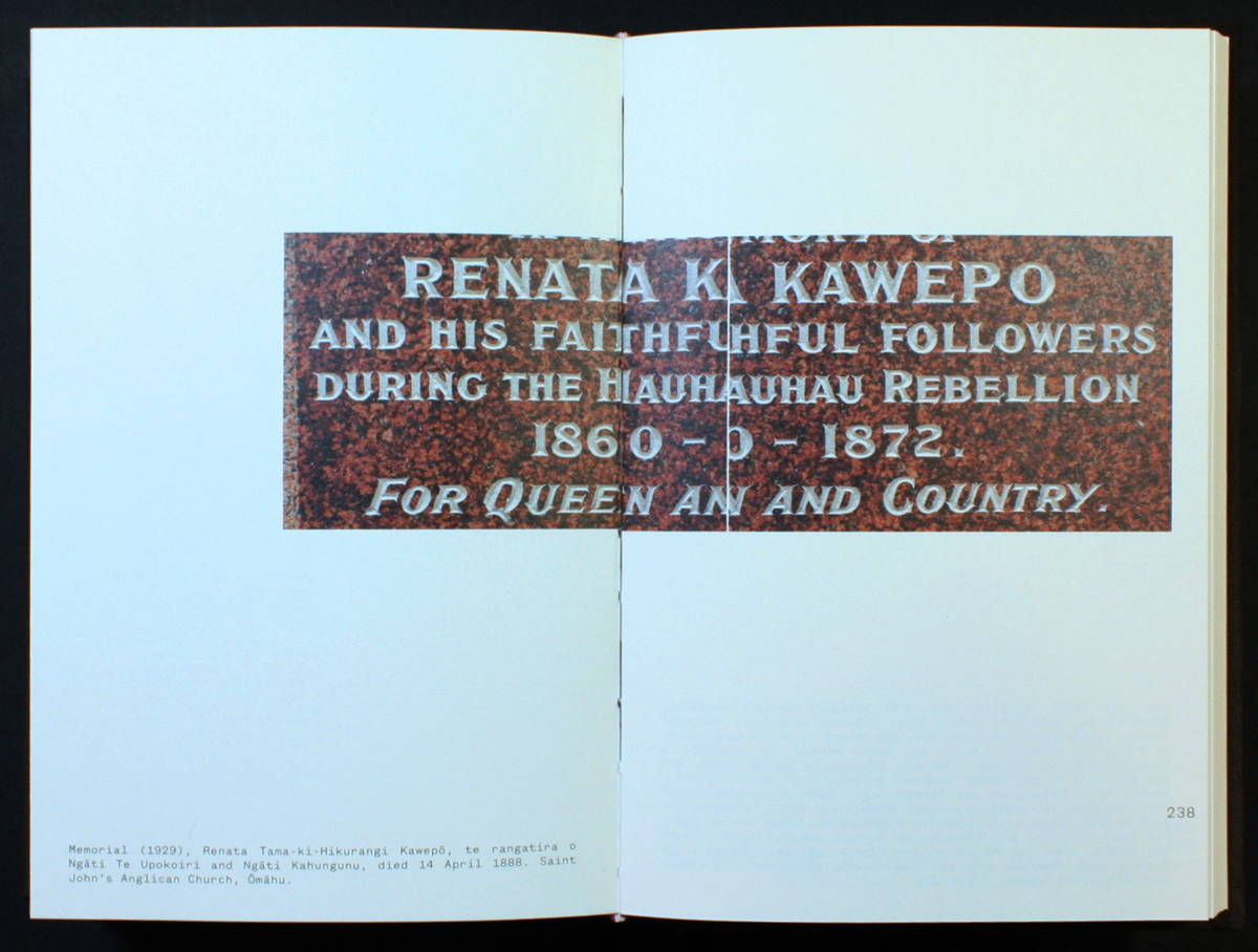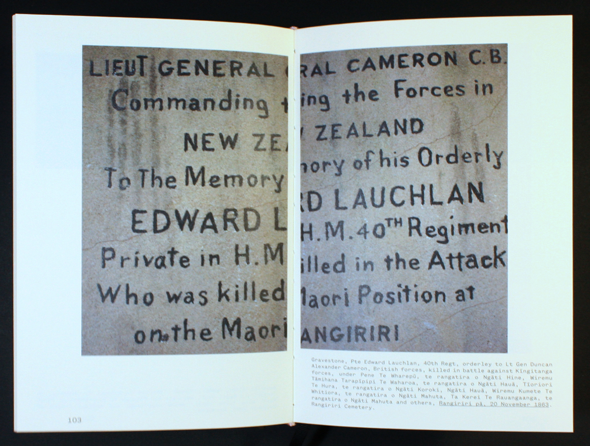 A Vocabulary, by photographer Bruce Connew, explores the casualties of colonisation through a selection of photographic images of memorials and gravestones. The book, designed by Catherine Griffiths and Bruce Connew, is a hefty, serious cloth-bound tome. It features a unique design element for which the page numbers travel with the reader around the page, making a full circle as you flick through the book. The circle is interrupted with a blue-paged chapter featuring an essay and He Mōteatea (traditional Māori ‘lament’ chants) from Dr Rangihīroa Panoho, before starting the count again. This design choice reflects the book’s message that the story of colonisation continues.