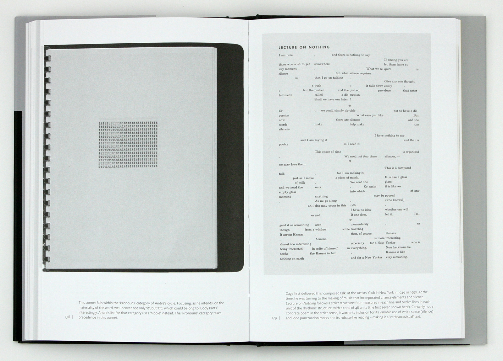 Spread from Concrete Poetry showing parts of the comb-bound One Hundred Sonnets by Carle Andre (left) and John Cage’s Lecture on Nothing.