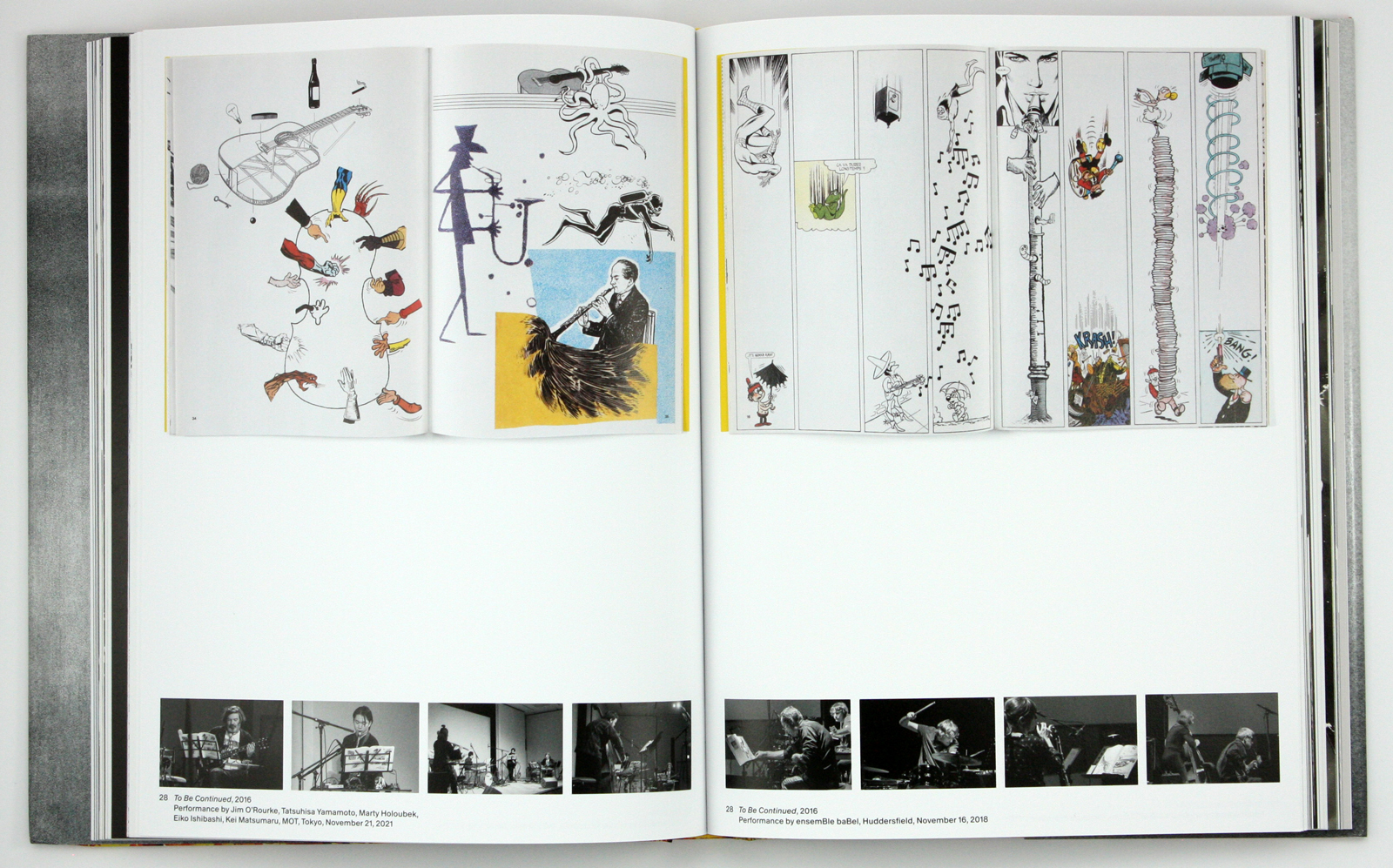 Pages from the graphic score No!, 2020, a sequence of collaged comic book panels, photos and other print ephemera with a musical bent. The smaller photographs at the foot document performances.