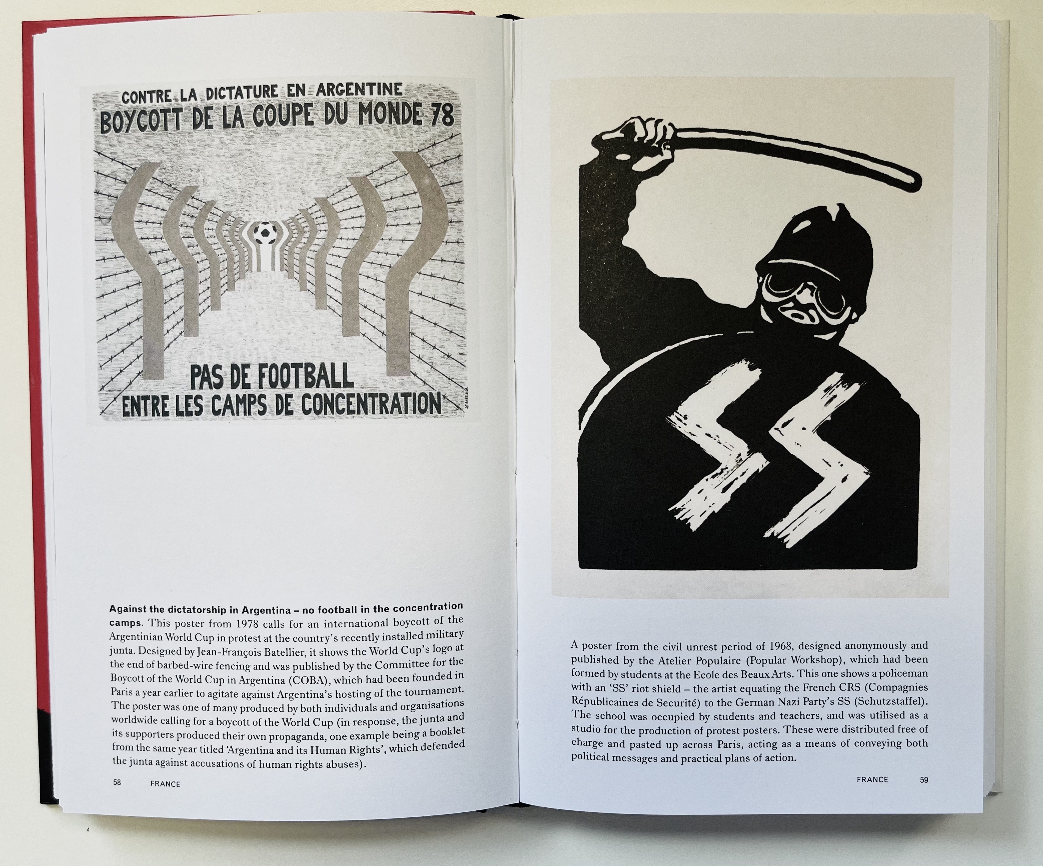 A spread from Propagandopolis, which features a poster (left) from 1978 which reads ‘Against the dictatorship in Argentina – no football in the concentration camps’. The French poster on the right is from the civil unrest period of 1968, designed and anonymously published by Atelier Populaire (Popular Workshop).