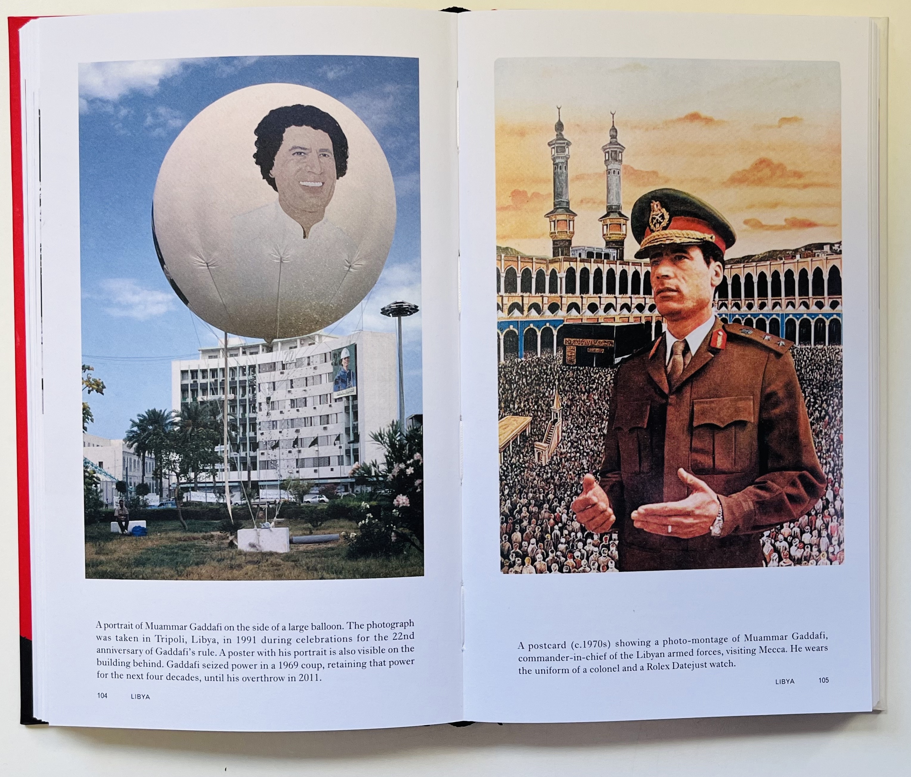 Right. A spread of two Libyan posters, the left a portrait of Muammar Gaddafi on a large balloon, celebrating the 22nd anniversary of Gaddafi's rule, 1991. On the right of the spread is a postcard (ca. 1970s) showing a photomontage of Muammar Gaddafi visiting Mecca.