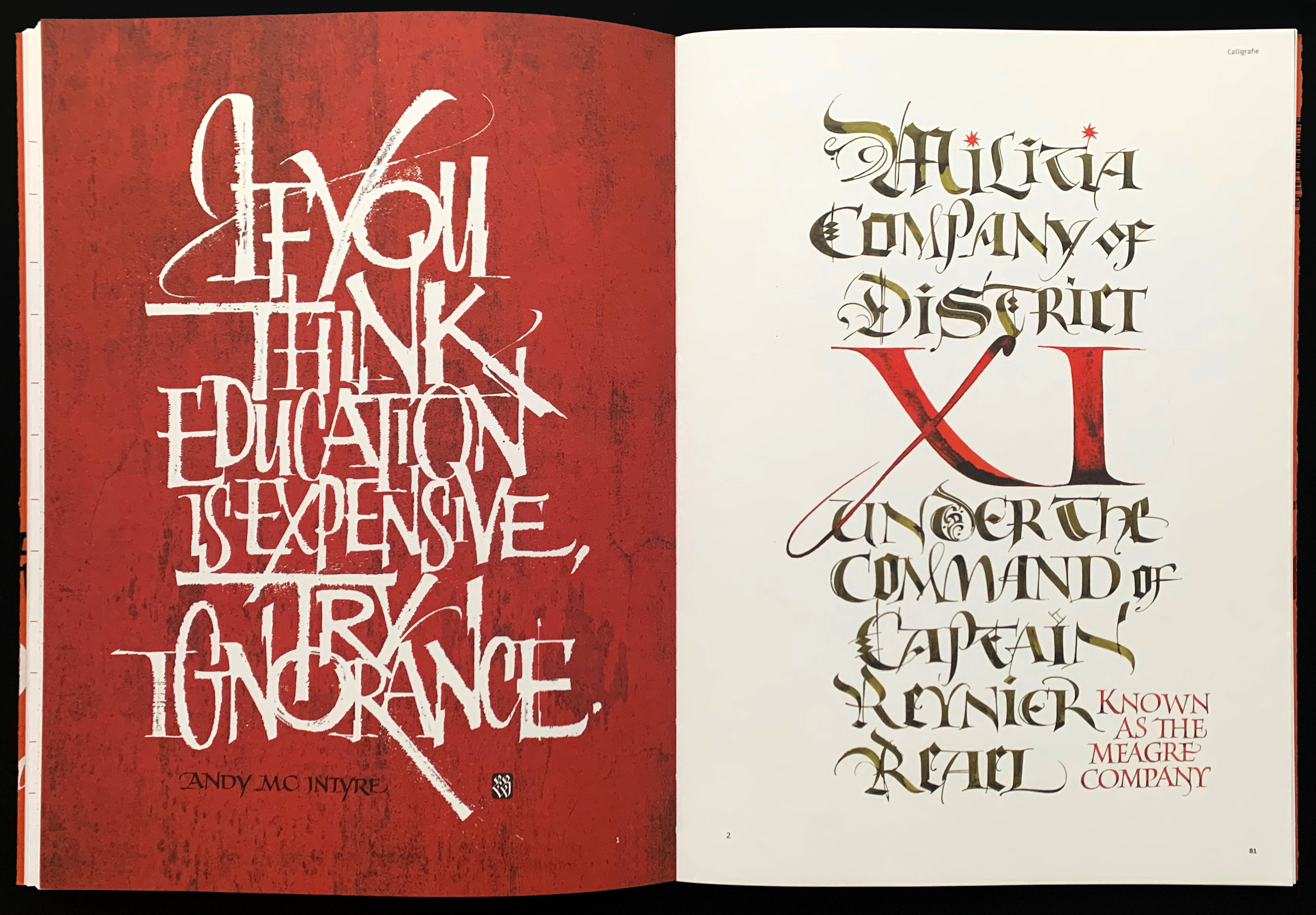 Spread from Manuale di Calligrafia showcasing works of Luca Barcellona (left) and Brody Neuenschwander.