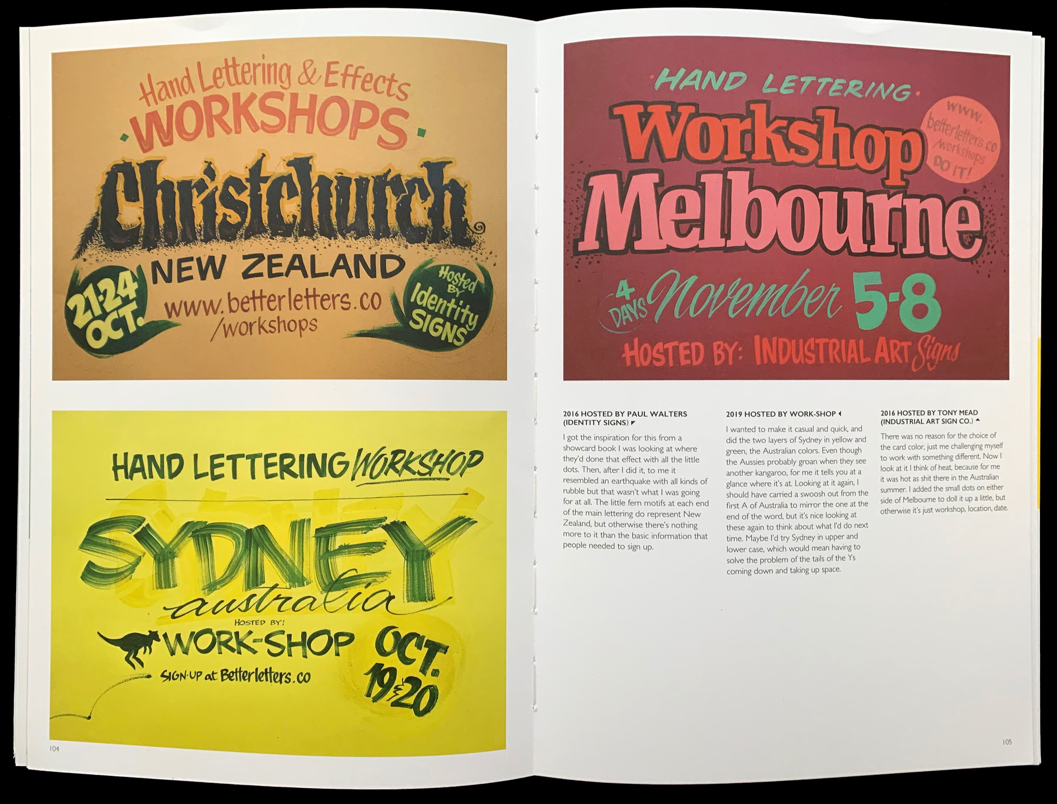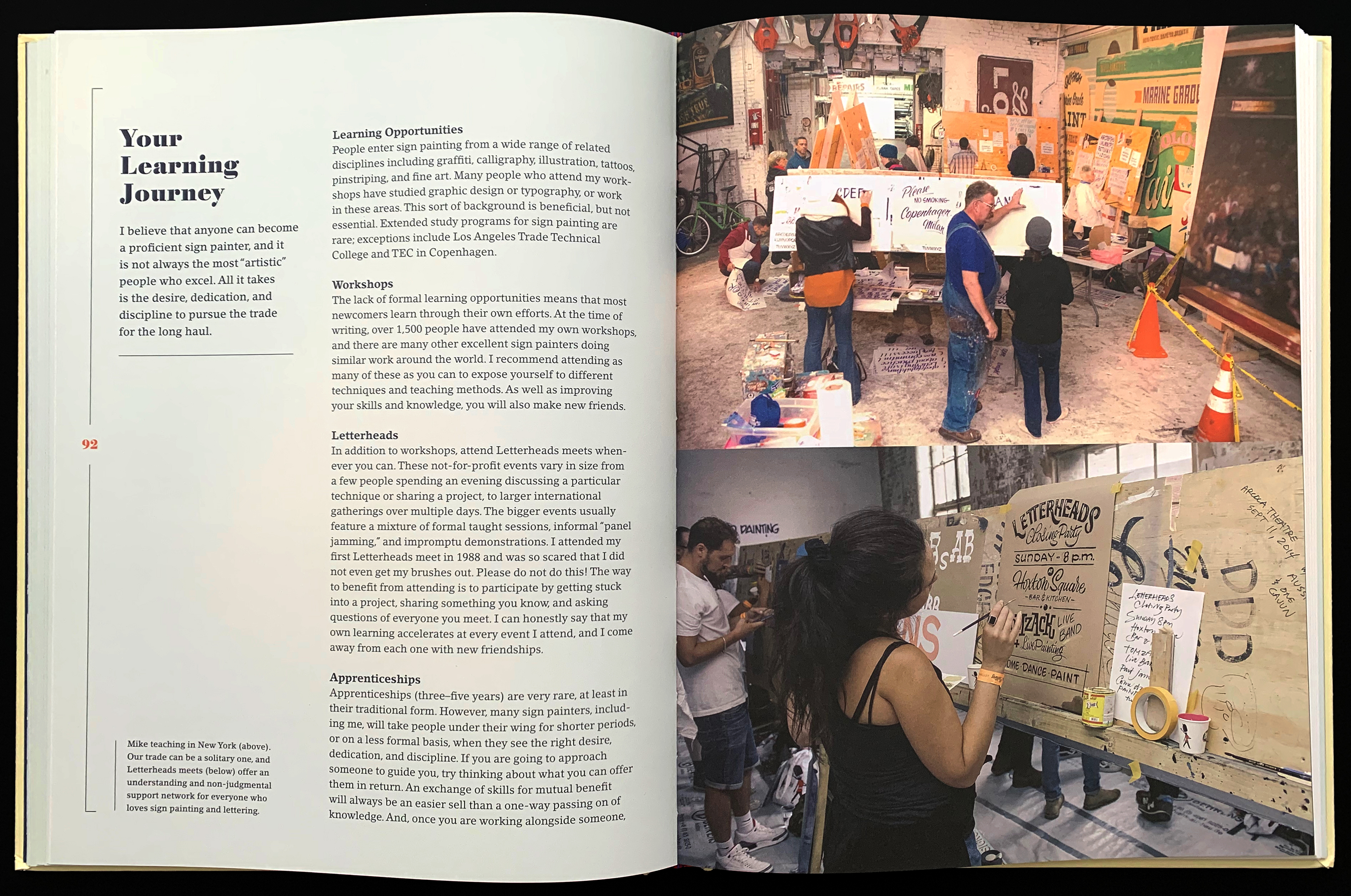 Spread from Sign Painting featuring photographs from sign writing workshops run by Better Letters.