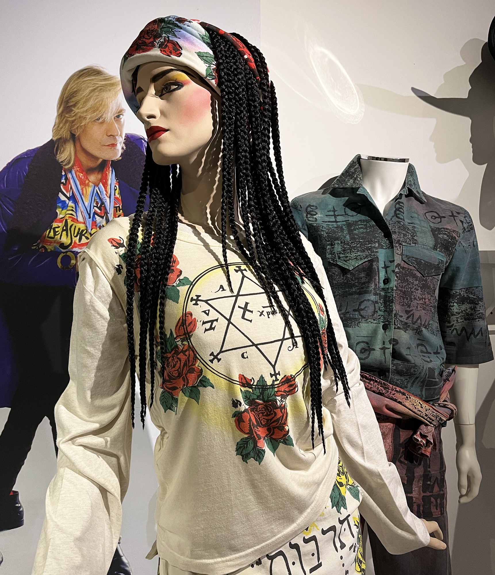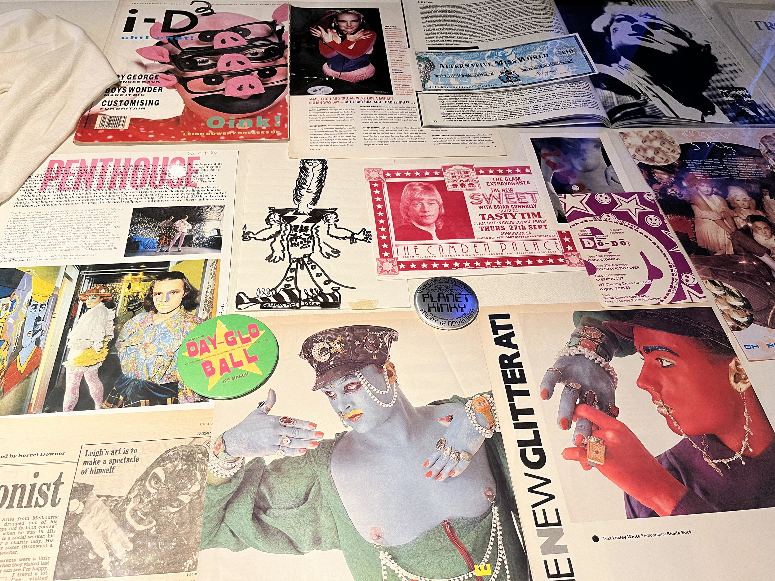 Upstairs explores the spread of Taboo’s influence into pop music, fashion and the media. We see outfits worn by Boy George, Neneh Cherry, Martin Fry of ABC and Bros. Some designers were scouted in the club by boutiques, with Browns buying both John Galliano’s and Dean Bright’s graduate collections, which are on display.