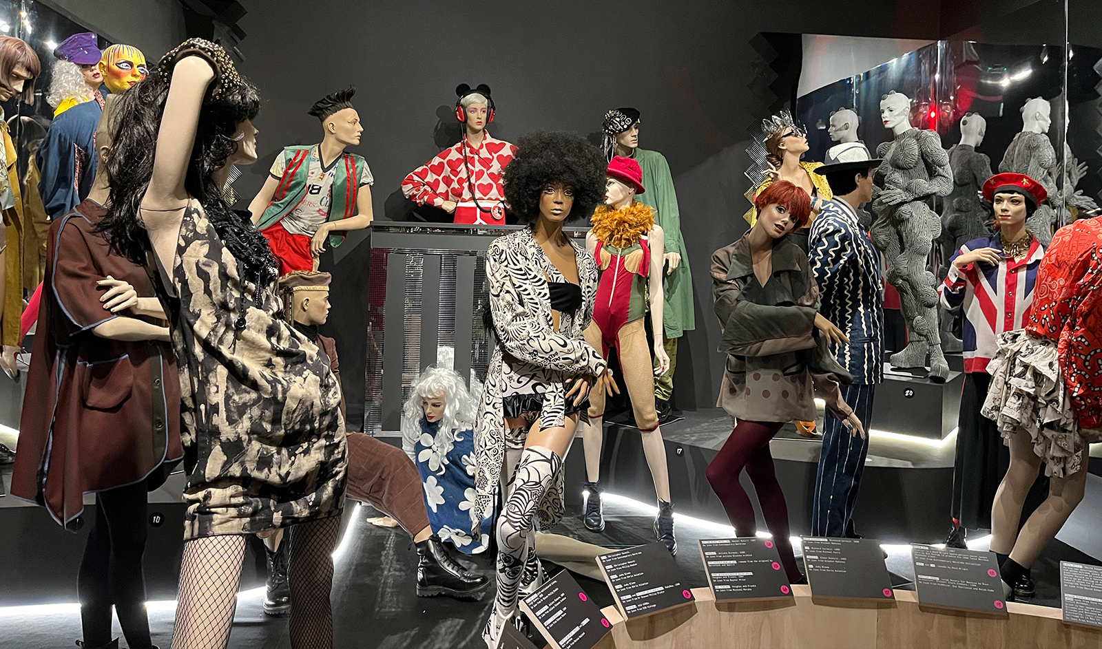 The club section of the exhibition recreates the dance floor at Taboo and was styled by former ‘club kid’ Dave Cabaret using Adel Rootstein mannequins from his collection. There are some recognisable characters in the crowd. The eclectic mix of influences – from Minnie Mouse to René Magritte – is a visual treat.