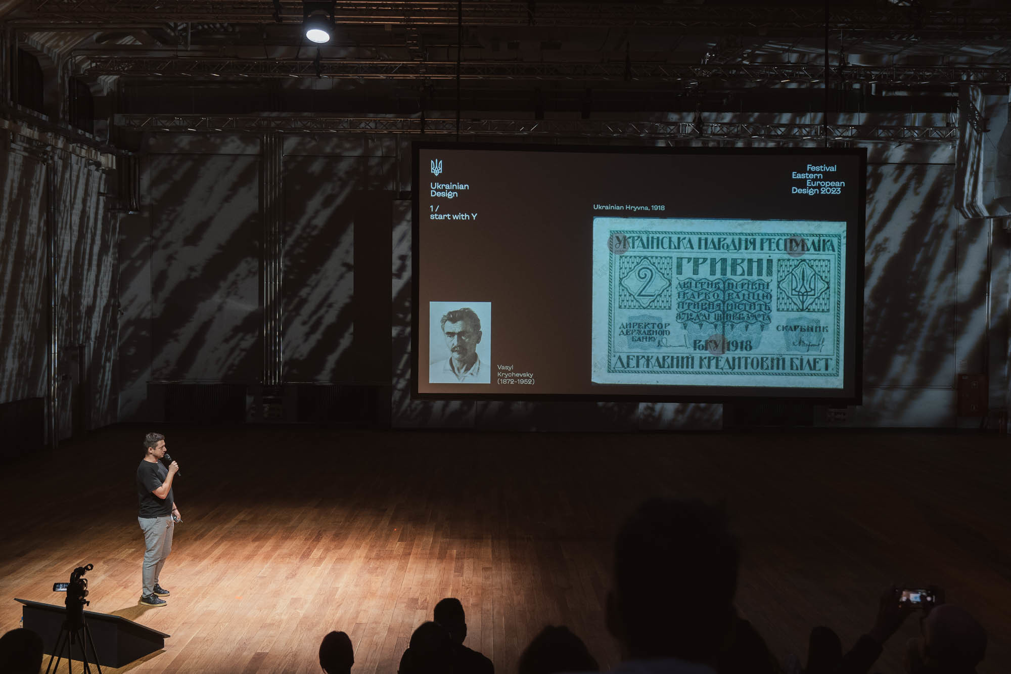 Sasha Tregub presenting typographic details from Ukrainian hryvnia, which inspired type design for branding of the Ministry of Digital Transformation of Ukraine. Photo by Patryk Wiśniewski.