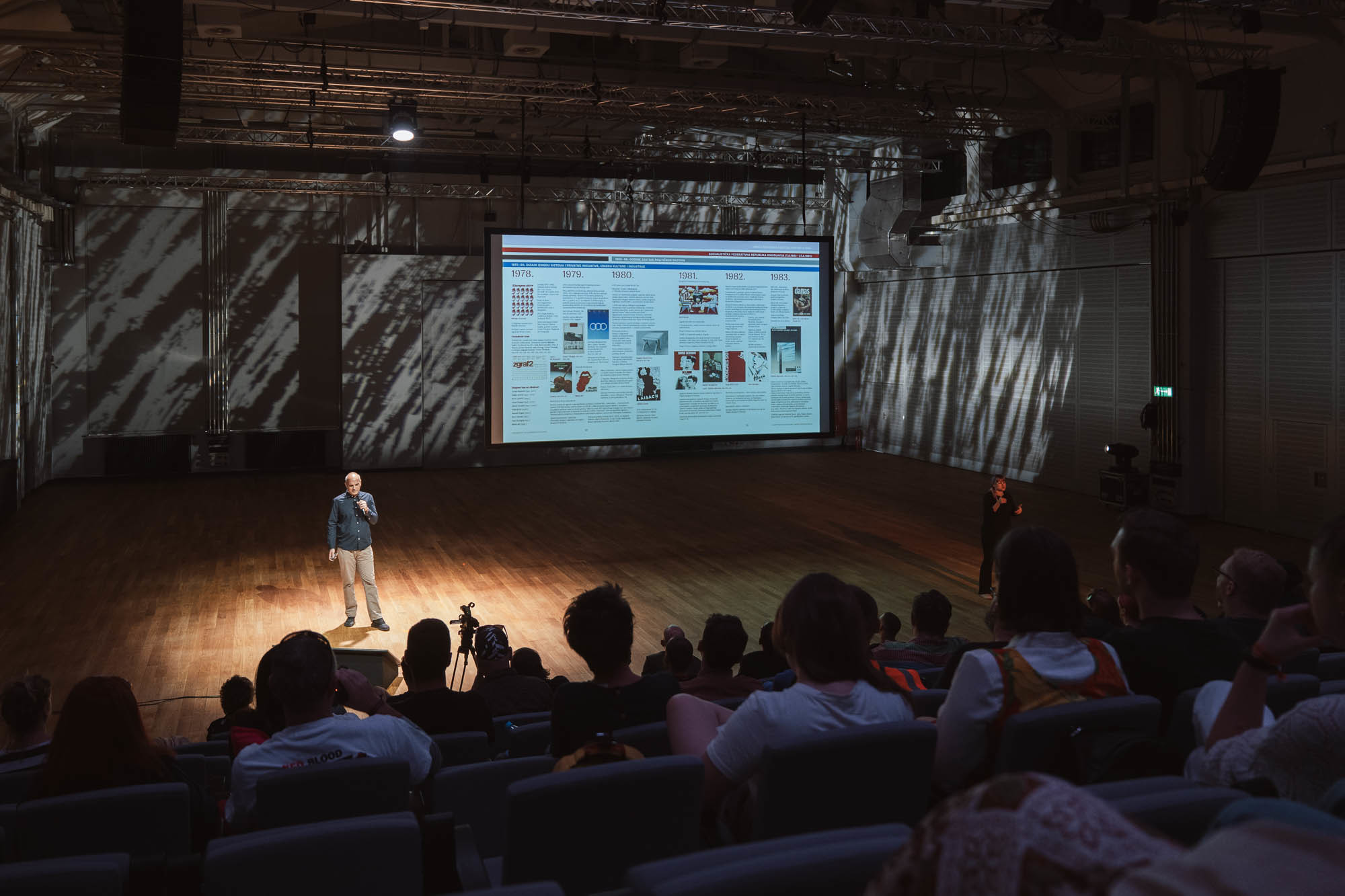 Marko Golub presenting the history of Croatian design on stage with a sign-language interpreter. All presentations were in English.