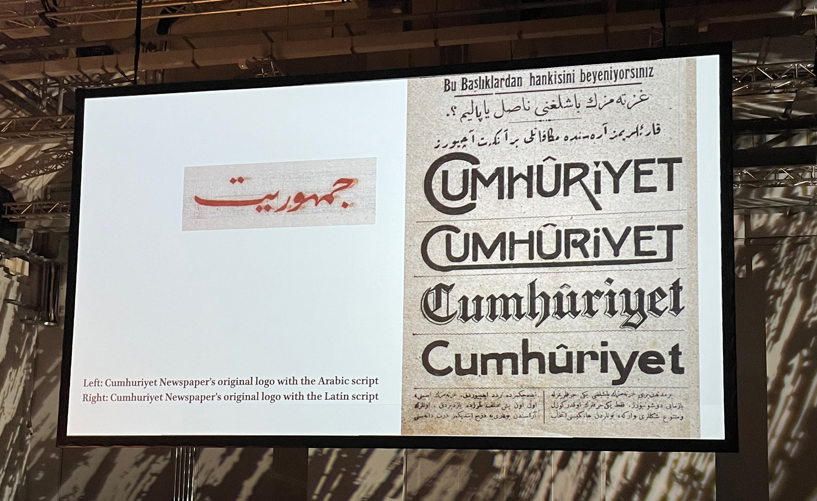 The shift from Arabic to Latin script shown in the Cumhûriyet newspaper, from the FEED presentation by Onur Yazıcıgil.