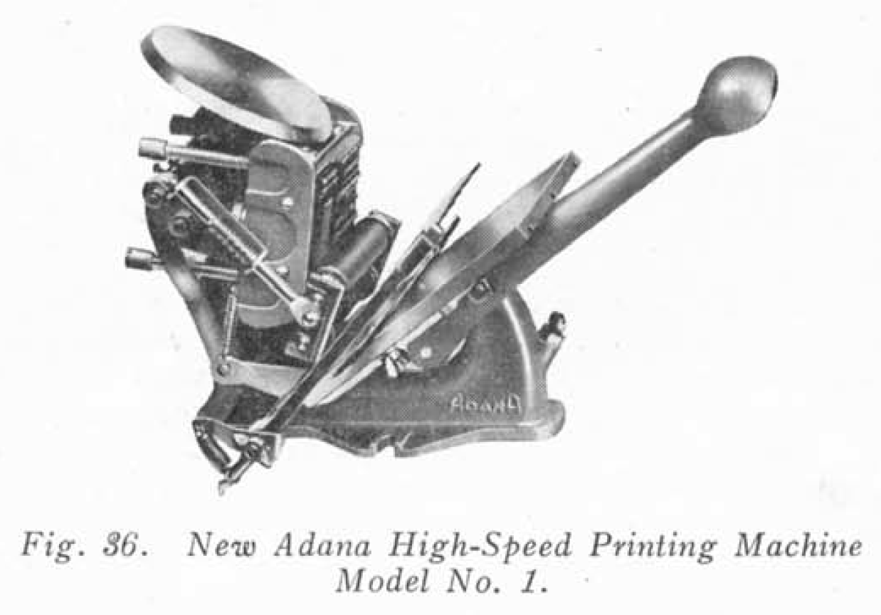 Picture of the New Adana High-Speed Printing Machine Model No. 1, featured in the Printing Made Easy instruction manual published by Adana in the 1950s.