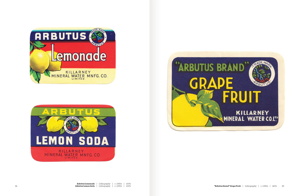 Spread from Grand Stuff: Label Art from Ireland by Niall McCormack, featuring labels for Arbutus from Killarney Mineral Water Co, produced lithographically in 1950s.