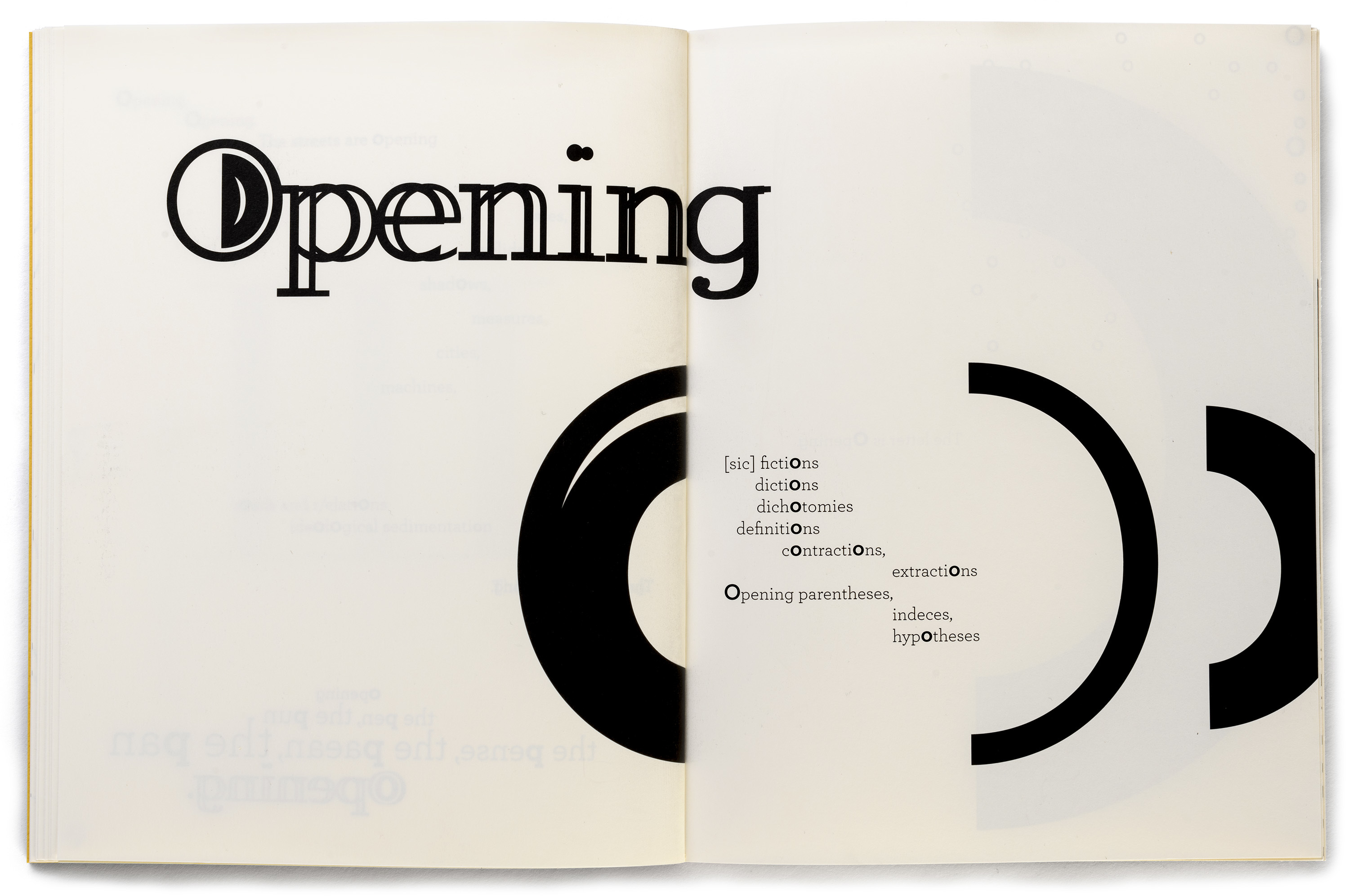 Despite the potentially sombre subject matter, Lehrer’s typographic explorations lighten the tone of the book, making it instantly engaging for the reader. In ‘Opening III’, the spreads (below) include numerous bold ‘o’s among the regular sans letters, encouraging the reader (unwittingly) to form a round shape with their mouth as they read.