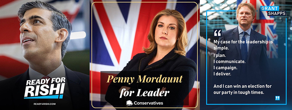 Publicity images for unsuccessful candidates for the Conservative Party leadership contest won by Liz Truss in September 2022. On the left (sic) is Rishi Sunak, who became leader (and prime minister) after Truss’s resignation in October.