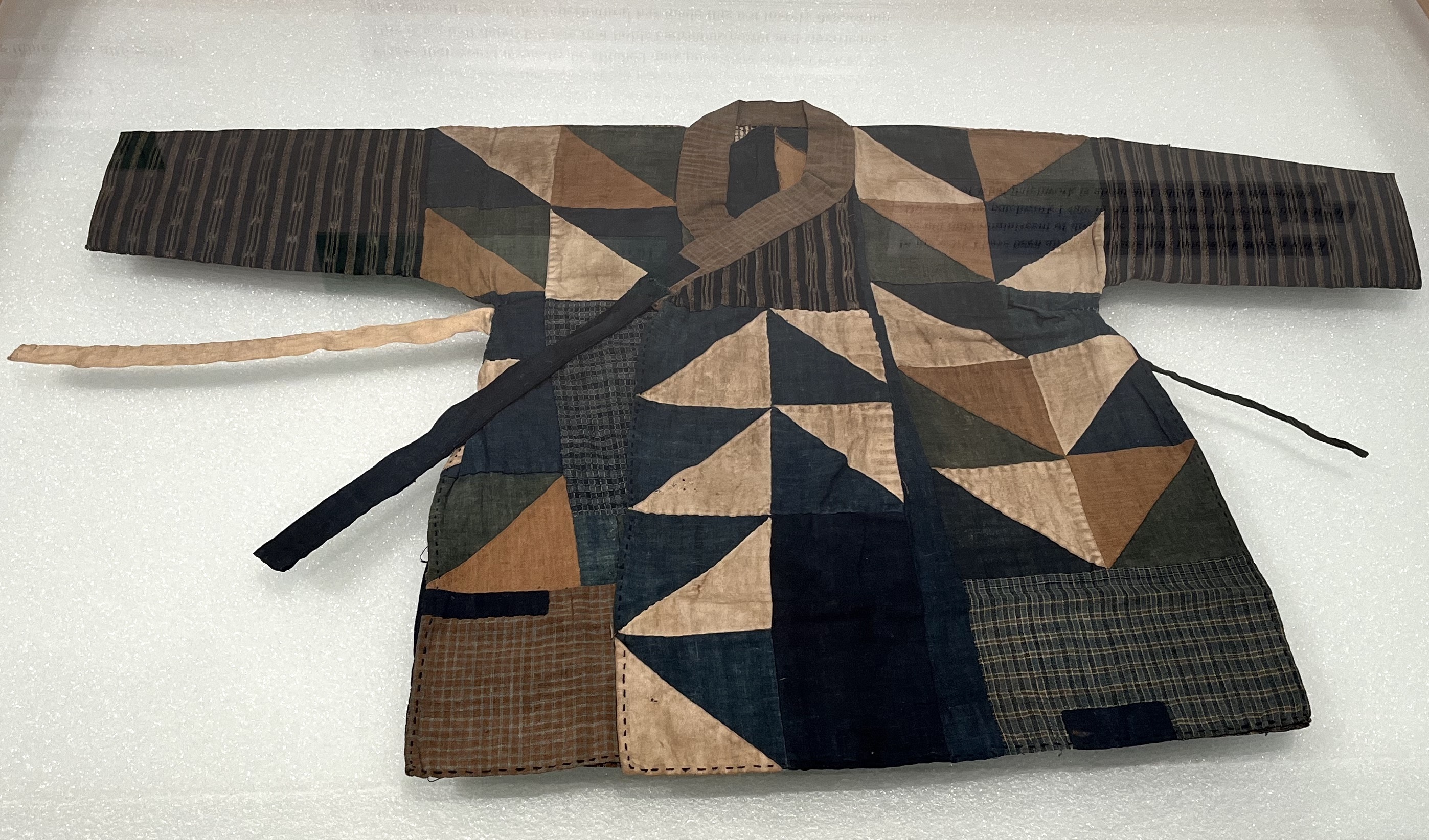 Fashion designer Morinaga Kunihiko has chosen a garment worn by young girls training to be priestesses in Amami. Worn during rituals, the Haburagin is a patchwork of fabric using cuttings from many different kimonos. Each triangle resembles a butterfly (or habera) which were thought to be floating spirits of ancestors and would protect the wearer.