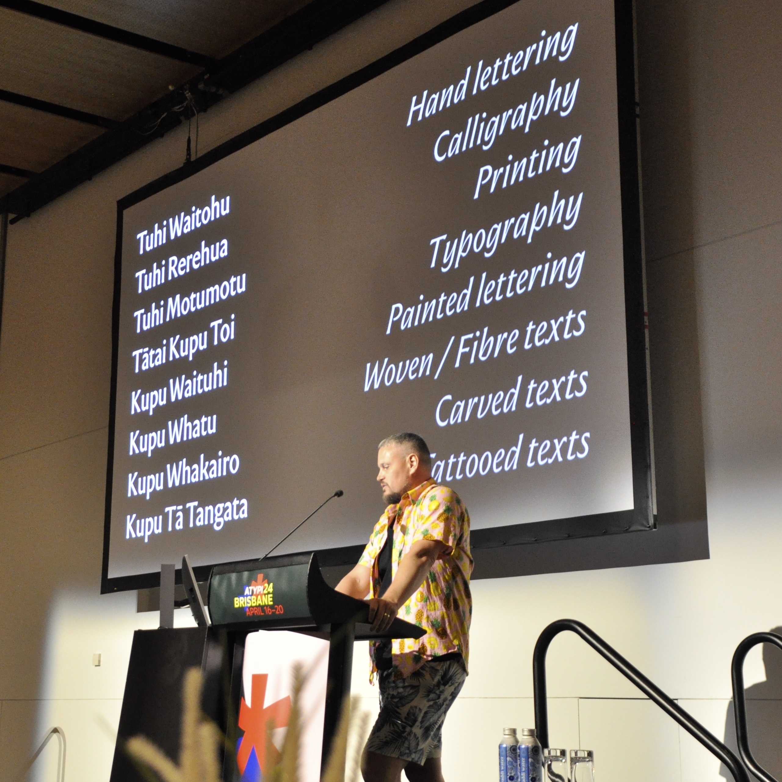 Top. Kris Sowersby presents the Matarongo Project, a collaboration with Dr Johnson Witehira. All photographs by Eric Liu.