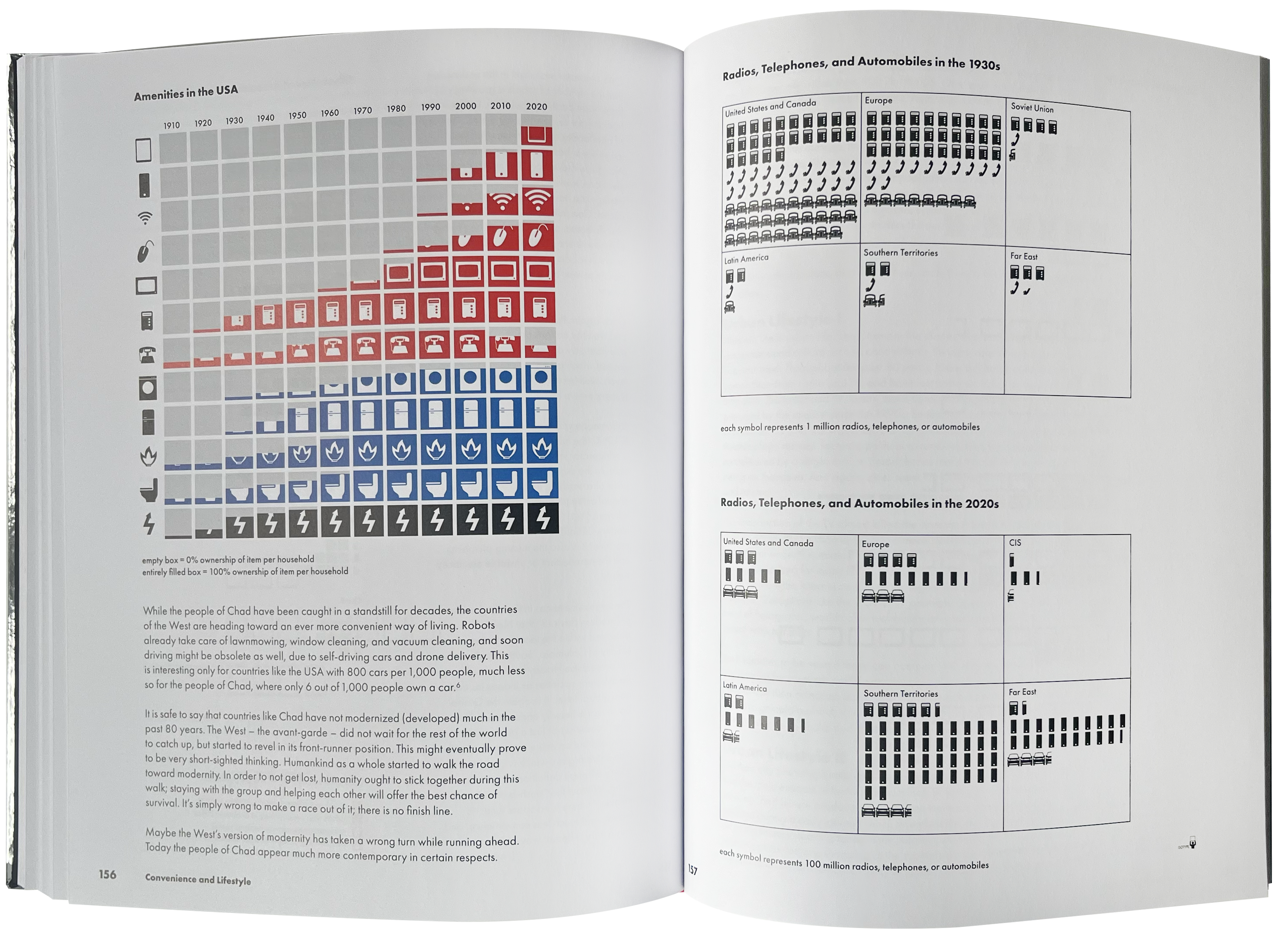 Just over 80 years ago, on the eve of the Second World War, Modern Man In The Making (1939) by Otto Neurath was published by Alfred Knopf. It was a pioneering, utopian book using a graphic language known as Isotype (International System of Typographic Picture Education) that covered subjects such as globalisation, emigration and the relationship between war and economy. Isotype’s objective was to transform often complex information into easily understood charts through the use of basic pictograms. The pictograms represented things like people, cars, telephones, bombs or energy, which could then be quantified and compared. Neurath intended to spread information with visual clarity and enable dialogue to initiate social change. Modernist in tone and structure, Modern Man In The Making is factual and above all international.