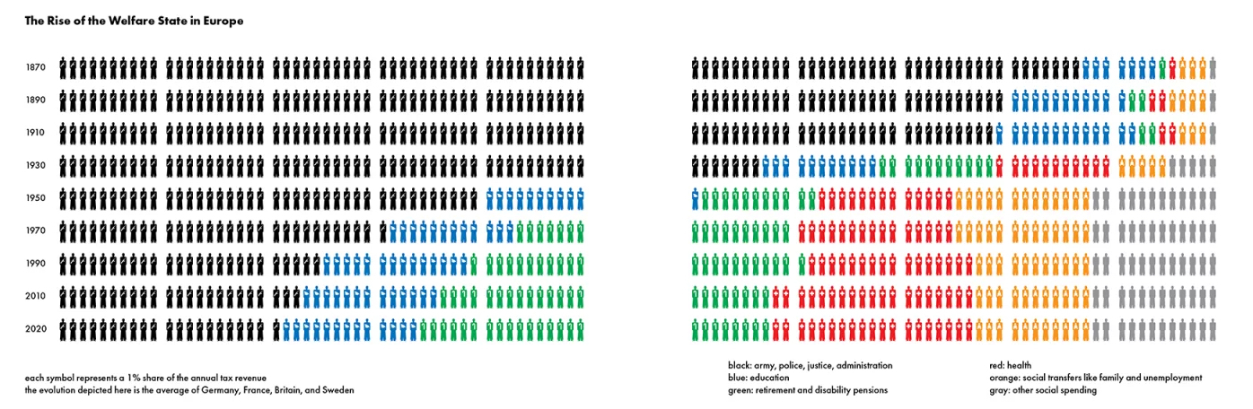 Like Neurath, Deutinger takes an international viewpoint. He also seeks to be faithful to the original style of the pictograms. In Neurath’s work all humans are depicted as men, unless they are specifically representing a woman. Deutinger quite sensibly updates this to a more androgynous form, while also attempting to remove sexist, racist and other exclusionary biases from other illustrations, but concedes ‘we cannot pretend to have done so perfectly, as the Isotype is by nature a generalising form of representation’. It would have been helpful if Deutinger had made a further concession and included pictograms in the key / legend to more of the charts. He does this for just one chart and for the rest provides descriptions such as blue filled, blue outlined, red filled, etc. which are not as easily understood.