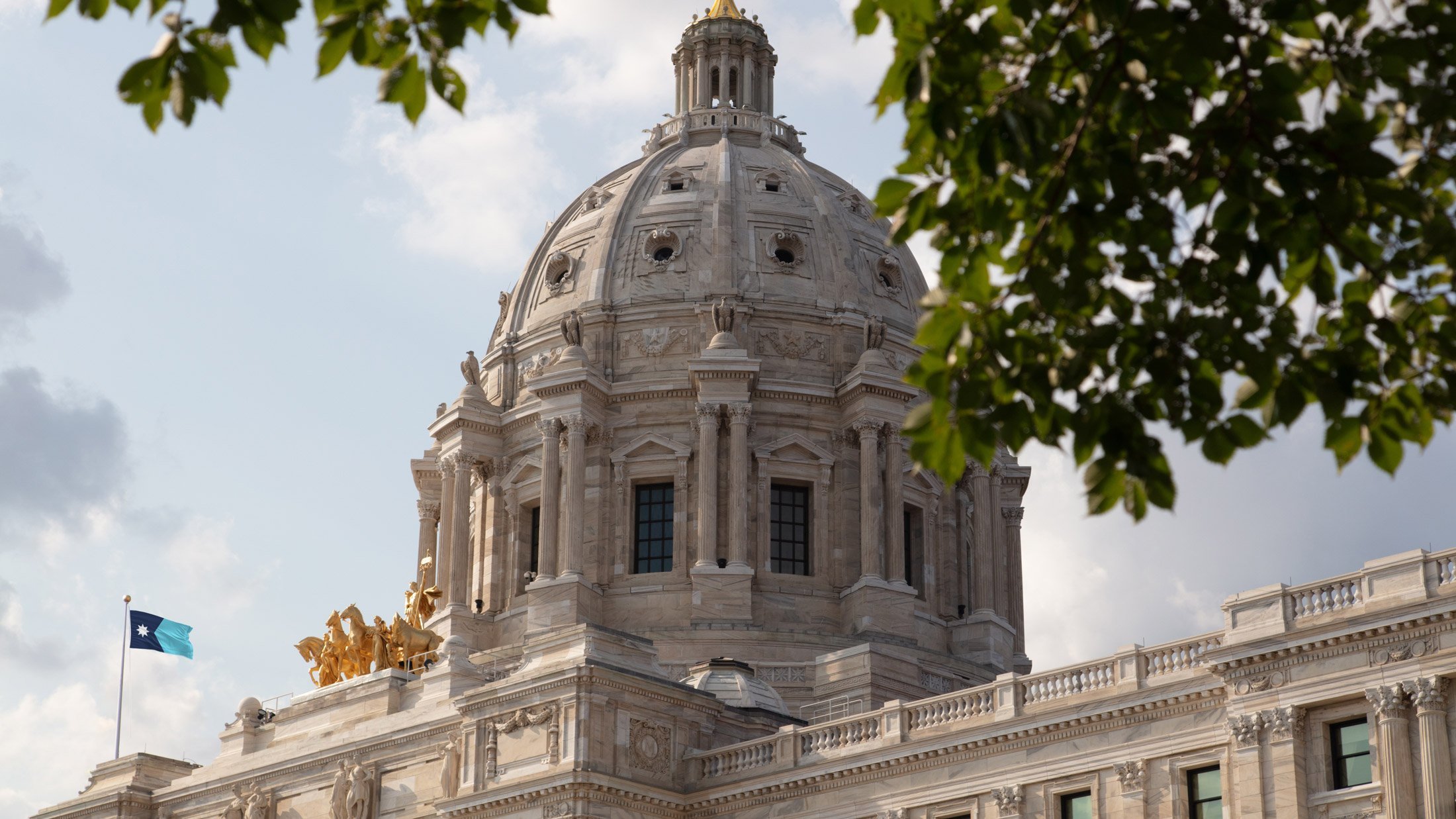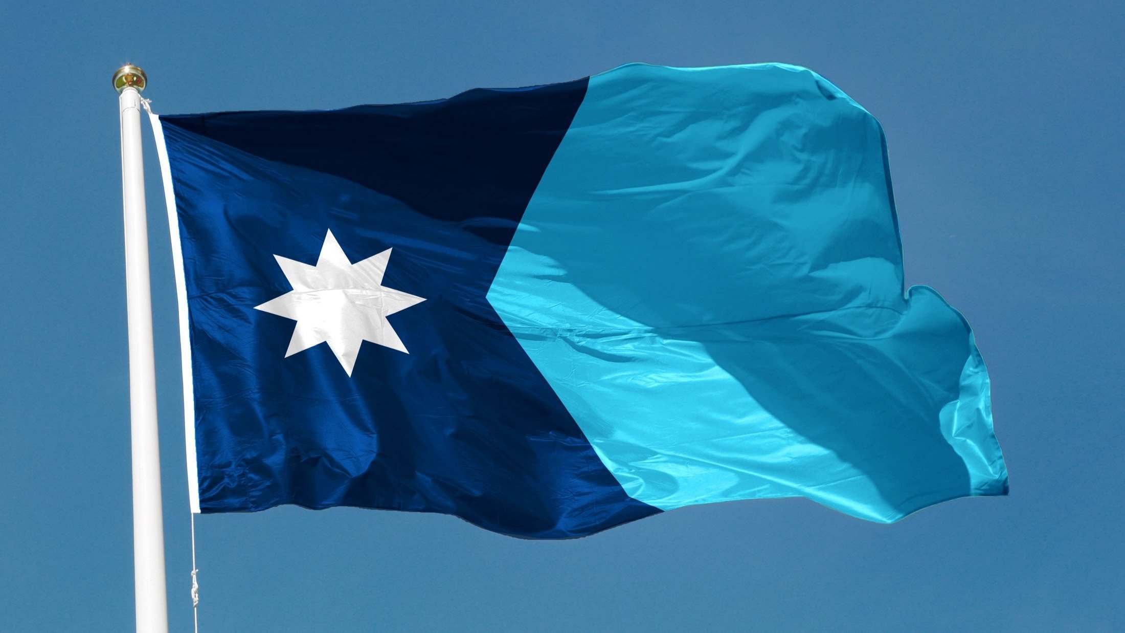 The current flag of Minnesota, due to be decommissioned in May 2024. Top. A mock up of the new flag flying at the Minnesota State Capitol.