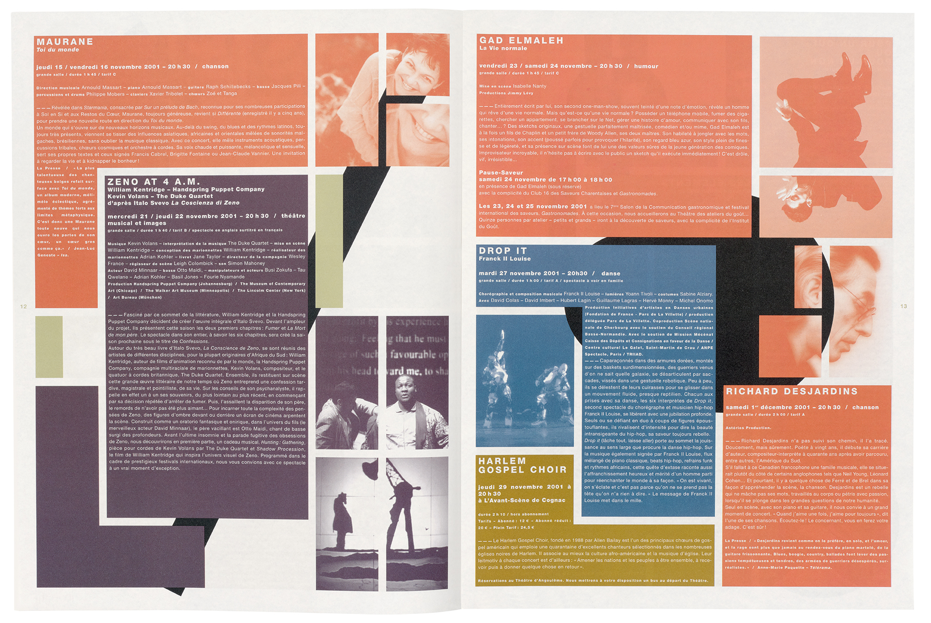 The first brochure they worked on together, for Angoulême’s 2001-02 season, was an early demonstration of how a friendly clash of two design views could produce a publication that was unorthodox yet accessible, and resulted in unusual graphic liveliness. Lenz had noted the grid-like structure of the monumental building’s façade, and had derived a simple scheme from it as a grid for the brochure. For Lenz, this also referred to the city’s world-famous comics festival and museum. On each double page she played with photos, texts, colours and changing patterns – the rectangular result was offset by Perrottet’s irregular background of diagonal black lines and geometric shapes.