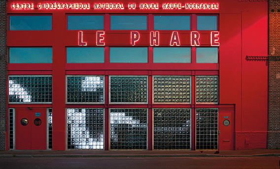 Lenz was invited by Emmanuelle Vo-Dinh, the new director of contemporary dance centre Le Phare in Le Havre, to develop a new identity and coordinate its visual communication. Under its previous directions, the dance centre had been called Centre Chorégraphique National, but in 2011 Vo-Dinh proposed its current name, which means ‘the Lighthouse’. Having produced an identity and a concept for the printed matter, Lenz was asked to design a typographic sign for the façade. She proposed a more radical solution: make the place radiate its function more expressively, focusing on light and movement. The building, a former storehouse in the rather bland environment behind Le Havre’s central station, tended to remain unnoticed.