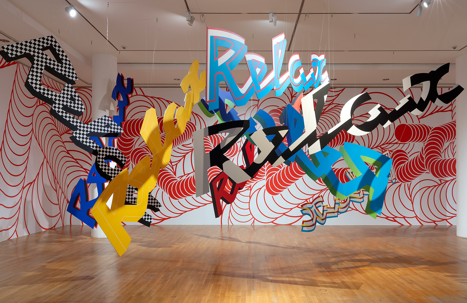 ‘à propos’, Frankfurt, 2020-21. In Lenz’s exhibition at the Angewandte Kunst, one room was completely dedicated to her dynamic, ‘floating’ identity for Le Nouveau Relax theatre in Chaumont.