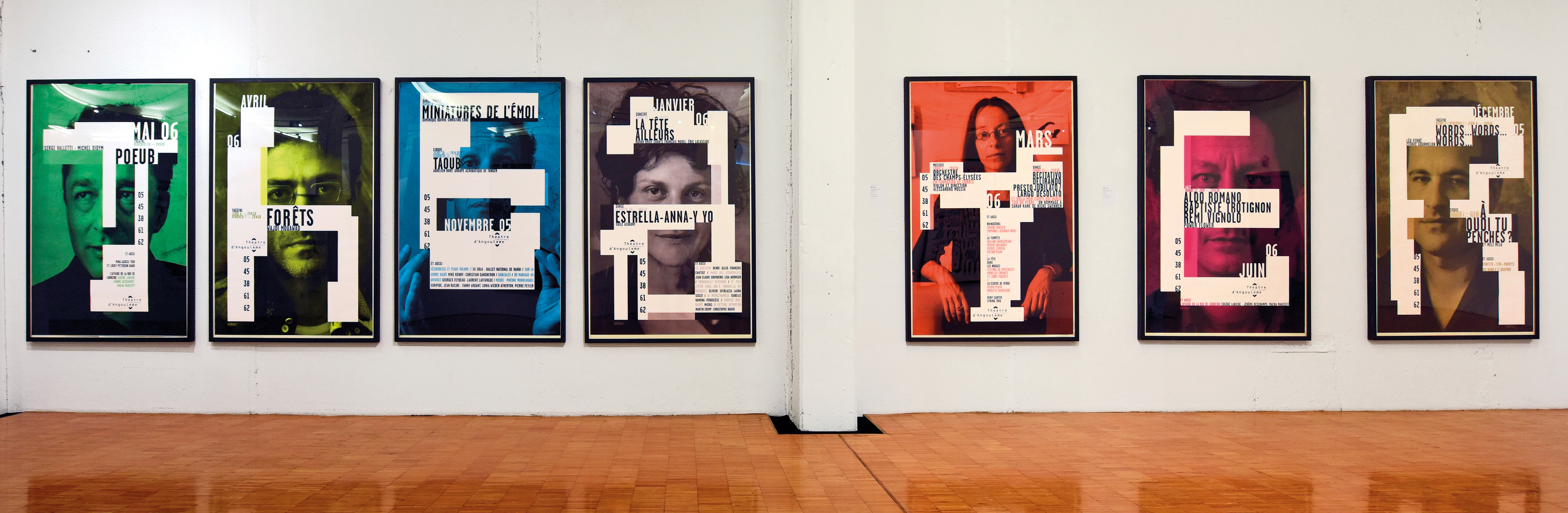 The Angoulême posters for the 2005-06 season feature monochrome portraits of actors’ faces, partially covered by white, apparently irregular shapes that contain information. Seen as a series, the shapes spell out the word ‘T-H-E-A-T-E-R’.
