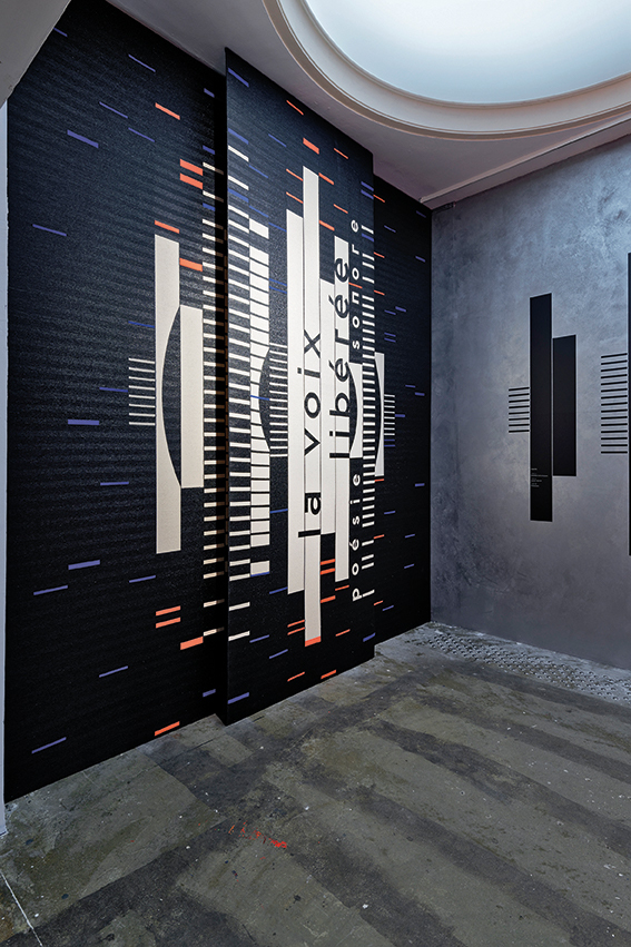 La Voix Libérée’, 2019. Lenz designed the abstract patterns on the textile panels and walls as a stylised visualisation of sound waves.