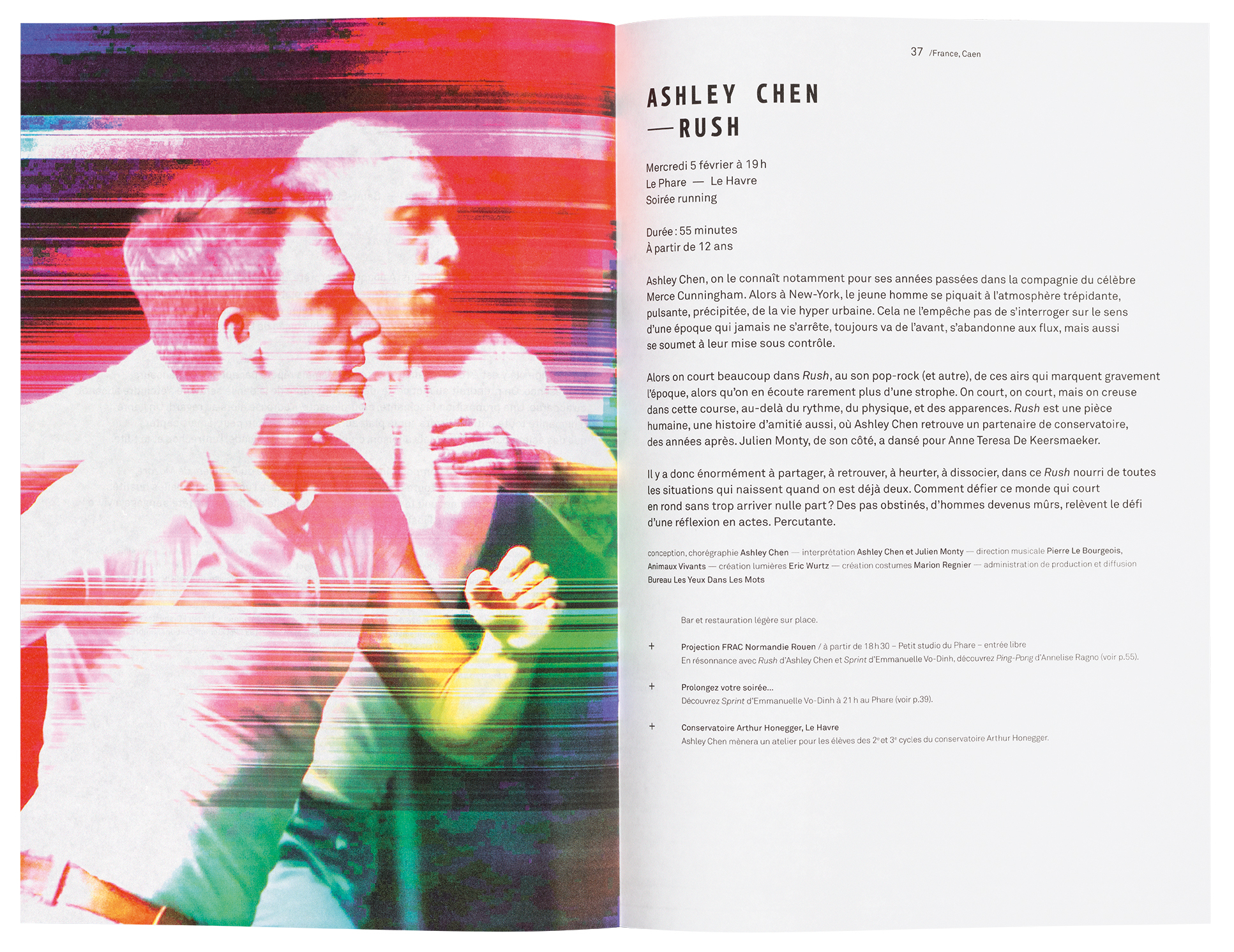 Le Phare’s printed matter changes each season. The basis for pages and posters are processed photographs of moving people, sometimes monochrome, recently as multicoloured outlines that simulate ‘aura photography’. Always intriguing, Lenz’s dramatic restyling of dance photos represents exactly the kind of communication a contemporary dance centre requires.