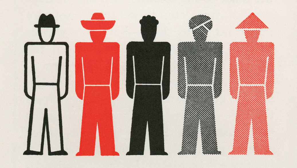 Spread from Otto Neurath’s International Picture Language, 1936. Top. Close up of the chart presenting new representation of different races featured in the book.