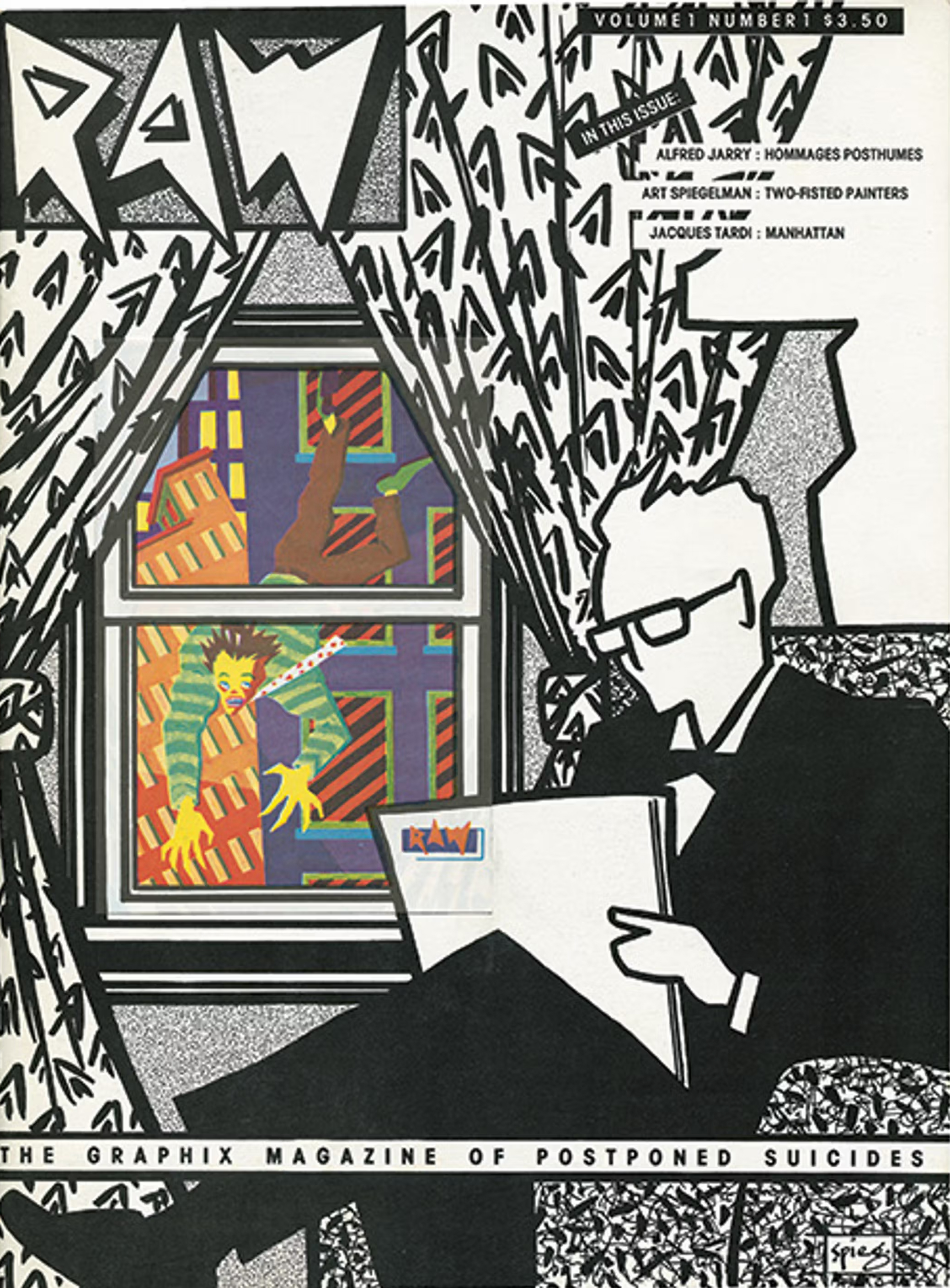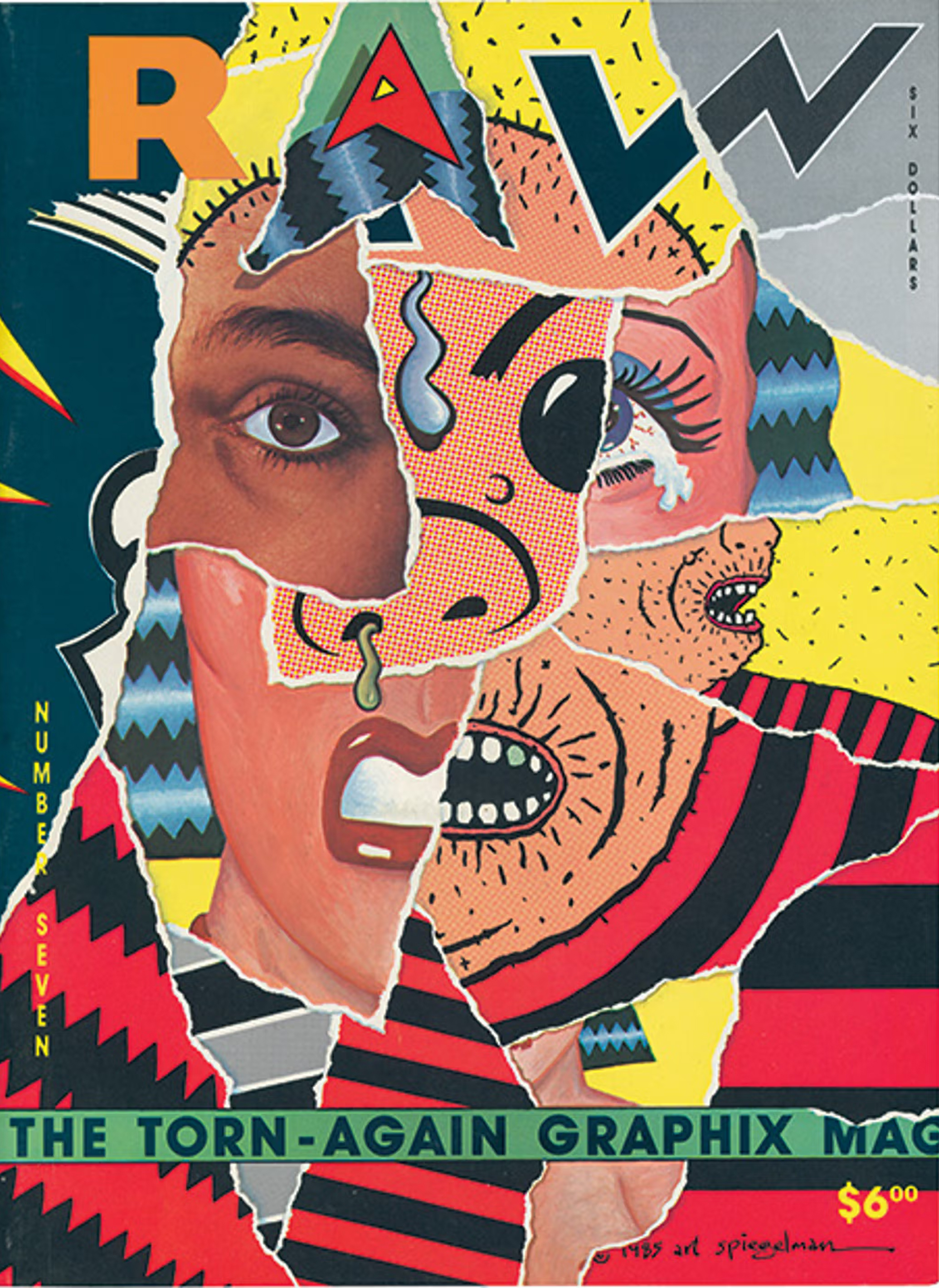 Raw 7 (1985), with cover illustration by Art Spiegelman, of which the upper right-hand corner is torn off. A torn piece randomly selected from another cover is taped to the corner of page 1.