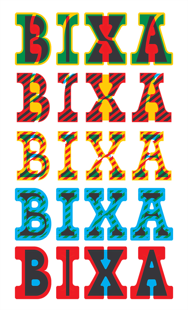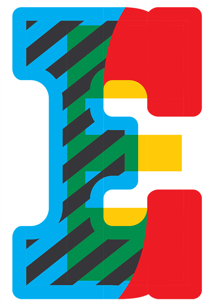 Examples of Bixa family, designed for large display sizes by Mark Wageningen, Novo Typo, 2015. Top. A giant (934pt) ‘E’ is constructed from four overlapping Bixa fonts: Stripe and Black Right (red), Black Left (blue) and Deconstruct (yellow).