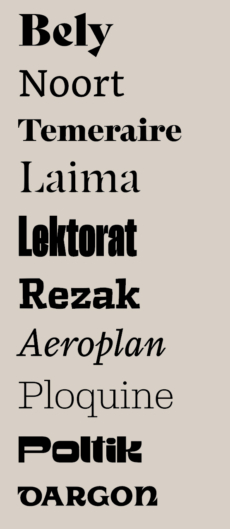 Winners of the Gerard Unger Scholarship initiated by Czech designer Veronika Burian and José Scaglione of TypeTogether.From top to bottom: Roxane Gataud, Bely, 2014. Juan Bruce, Noort, 2015. Quentin Schmerber, Temeraire, 2016. Bogidar Mascareñas, Laima, 2017. Florian Fecher, Lektorat, 2019. Anya Danilova, Rezak, 2020. Nina Faulhaber, Aeroplan, 2021. Emma Marichal, Ploquine, 2022. Patrycja Walczak, Poltik, 2023. Anne-Dauphine Borione, Dargon, 2024.