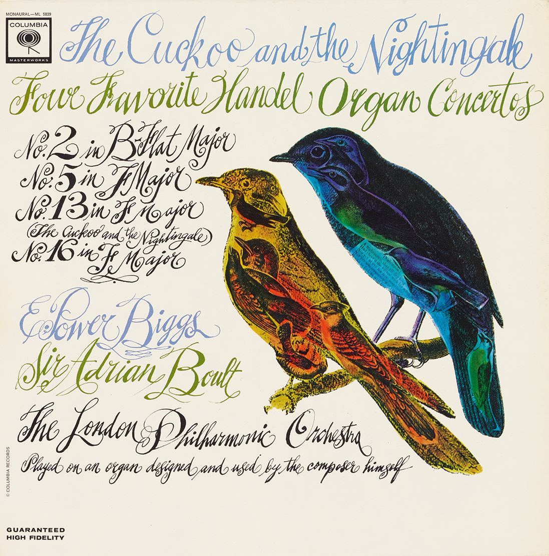 The Cuckoo and The Nightingale, Four Favorite Handel Organ Concertos, Columbia Masterworks, 1963. Artwork and cover design by Henrietta Condak. Lettering by Irene Trivas. All album covers: art direction and design by Henrietta Condak.