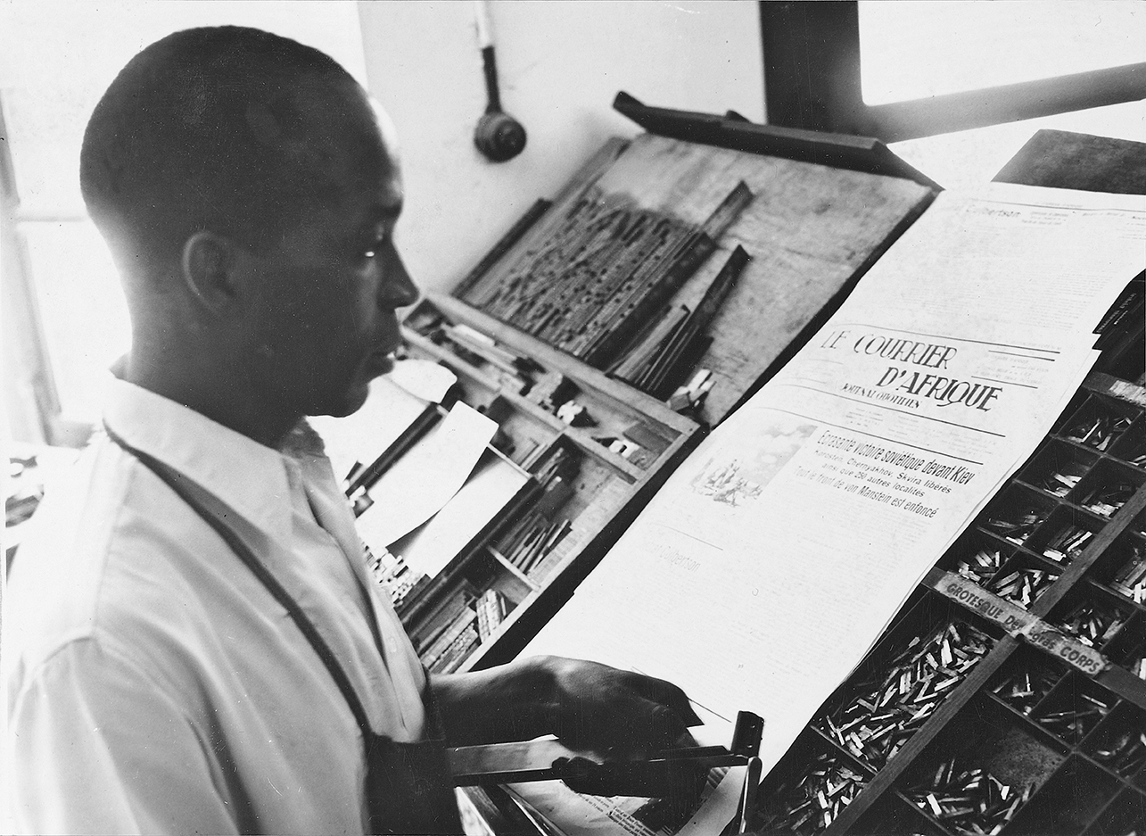 Typesetter with composing stick, working for Le Courrier d’Afrique, 1956. Photo by J. Costa. Courtesy Collection KMMA, Tervuren.