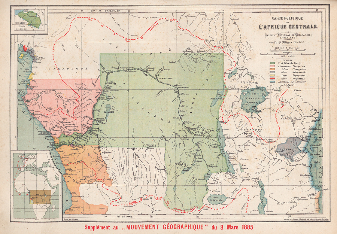 Political map of Central Africa, its boundaries drawn crudely with a ruler, printed in a supplement to Le Mouvement Géographique, Institut national de géographie, 1885. Attributed to Alphonse-Jules Wauters, courtesy Collection KMMA, Tervuren.