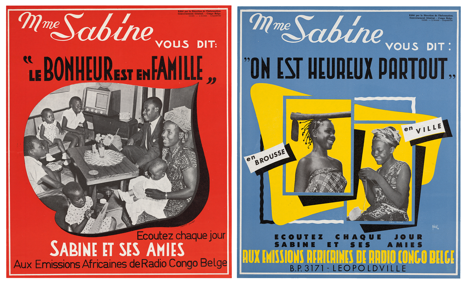 Posters for Mme Sabine radio programme, Radio Congo Belge, 1958, courtesy Collection KMMA, Tervuren. Designed by A. Noiret.