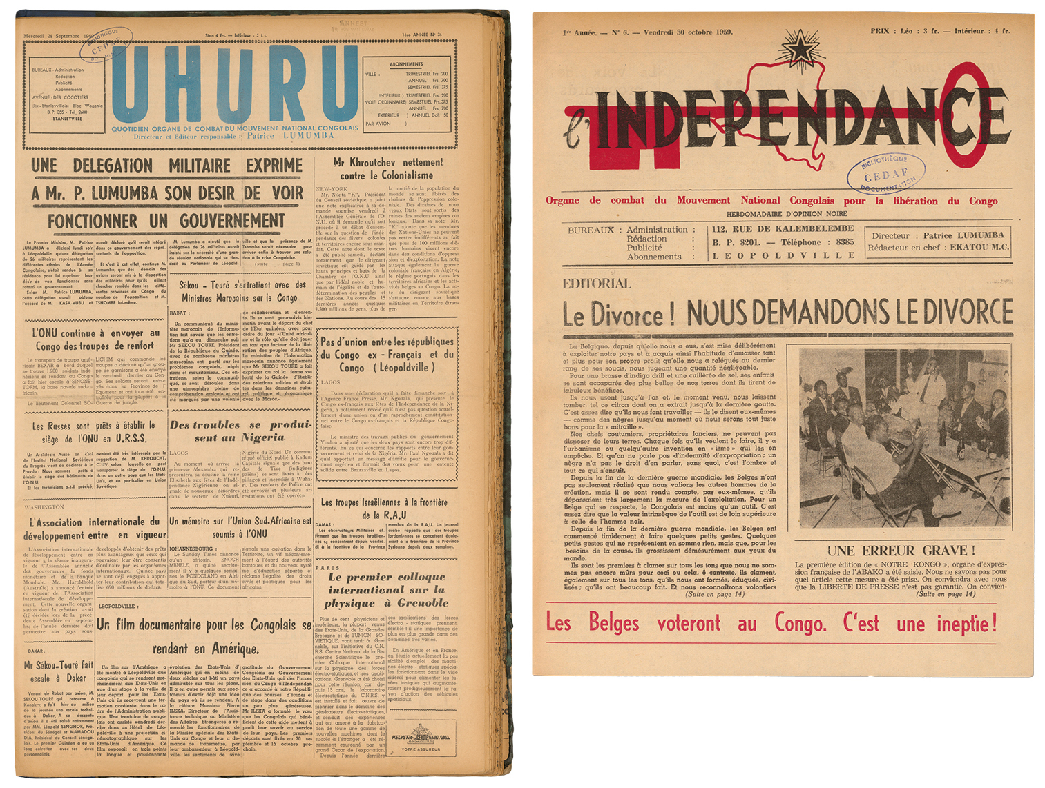 L’Indépendance, issue no. 6, 30 October 1959, and Uhuru, issue no. 17, 28 September 1960, courtesy Collection KMMA, Tervuren. Published by the Mouvement National Congolais (MNC).