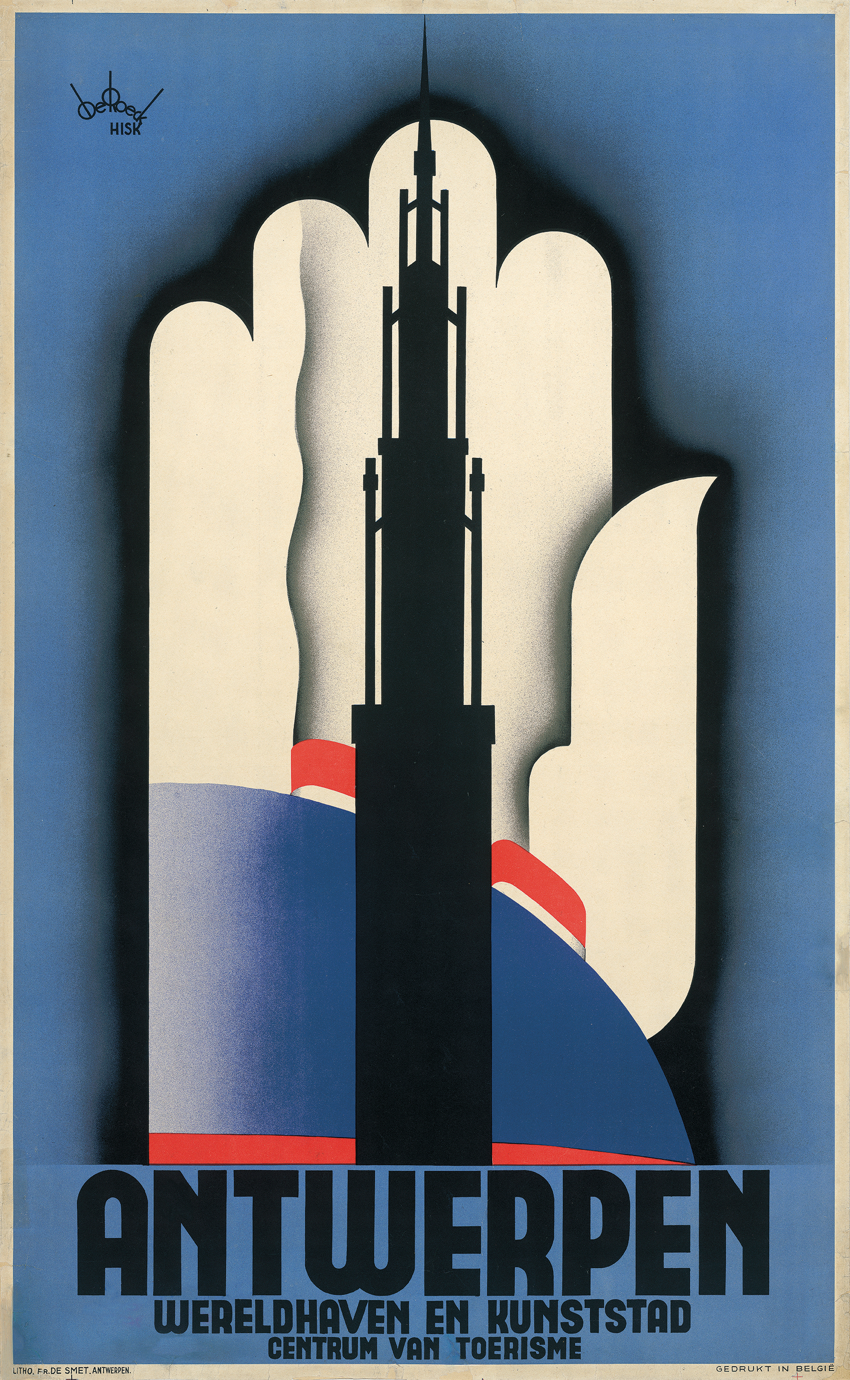 Lucien De Roeck’s well known poster for the city of Antwerp, 1935, courtesy Fonds Lucien De Roeck. Top. Poster for Colonial Days: Under the high patronage of His Majesty the King, 1924, courtesy Collection KMMA, Tervuren. Joseph van den Bergh’s duotone poster uses the widely recognisable image of the late Belgian monarch, Leopold II (1835–1909), as a ‘logo’ for colonisation.