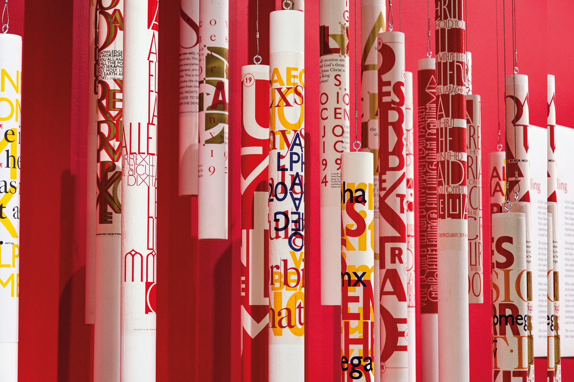 The November 2023 exhibition ‘Extol’ was a vivid opportunity to see the work of British typographic designer and academic Phil Baines. Held in the Lethaby Gallery at Central Saint Martins in London, where he was Emeritus Professor, it showed the breadth and generosity of Baines’s practice, taking in his student notebooks and cards, catalogues and identity design, type design, posters, public signs and memorials, research, books, articles (many written or co-written for Eye) and his striking student work. The main focus of the show was a spectacular display of Paschal candles.