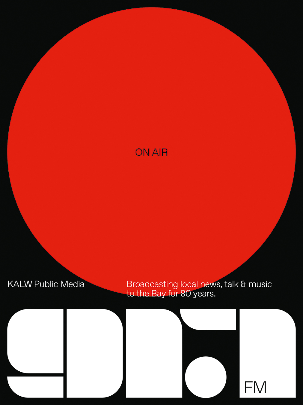 KALW Public Media, 2021. For eighty years, pioneering Bay Area public radio station KALW has served its listeners with local talk, news and music shows that are socially minded and community focused. Working closely with KALW’s team, Collins designed a new identity and branding system. Top. Portrait by Maria Spann.