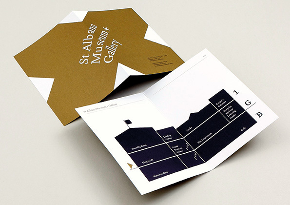 The St Albans Museum + Gallery identity is for a Georgian building that was converted from town hall to museum for the local council. Sutherland explains: ‘They have a St Alban’s cross, like a saltire, so we used the negative spaces, the triangles, to create patterns. There isn’t a single mark. We also used the triangles for arrows in the signage.