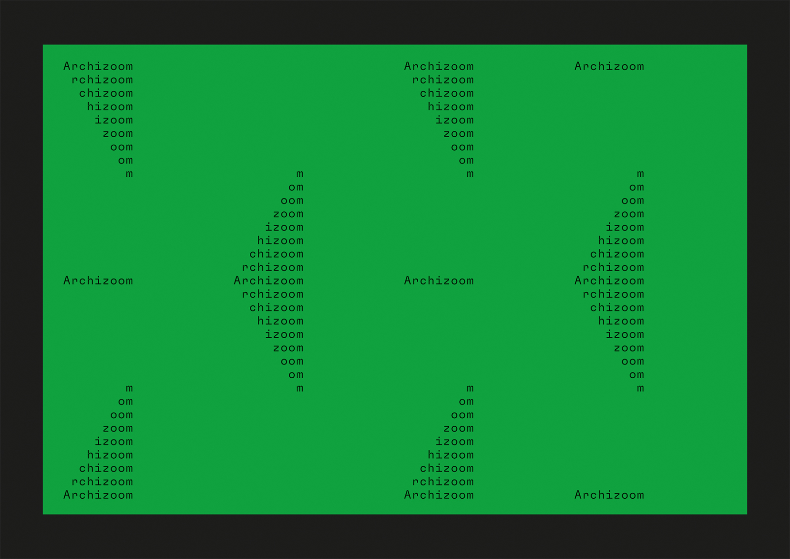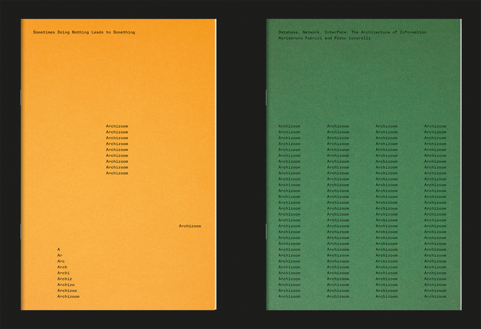 Identity design for Archizoom, a cultural platform for exhibitions, conferences and debates on architecture, 2021 and ongoing. Located on the EPFL campus in Lausanne, Switzerland and named after the 1960s radical group Archizoom Associati, the gallery reflects the notion that design, in its broadest sense, is inseparable from research and political engagement.