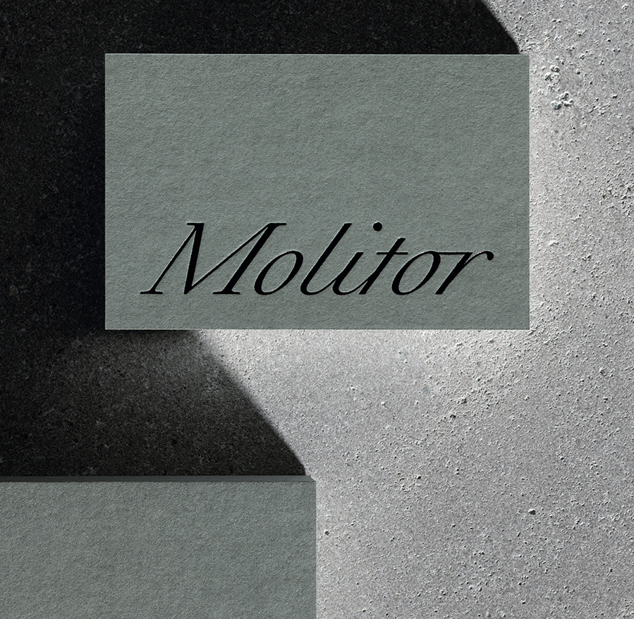 Identity design for Molitor, 2022. This art gallery was founded in that year by Marie-Christine Molitor in a residential development near Berlin’s Potsdamer Straße. Atelier Dyakova aimed to create a ‘warm and personable’ identity, using handwriting as a starting point. The wordmark was made in a typeface by Raphaël Verona. The stationery range uses colours that reflect the building’s steel and concrete finishes. Photography: Ed Park.