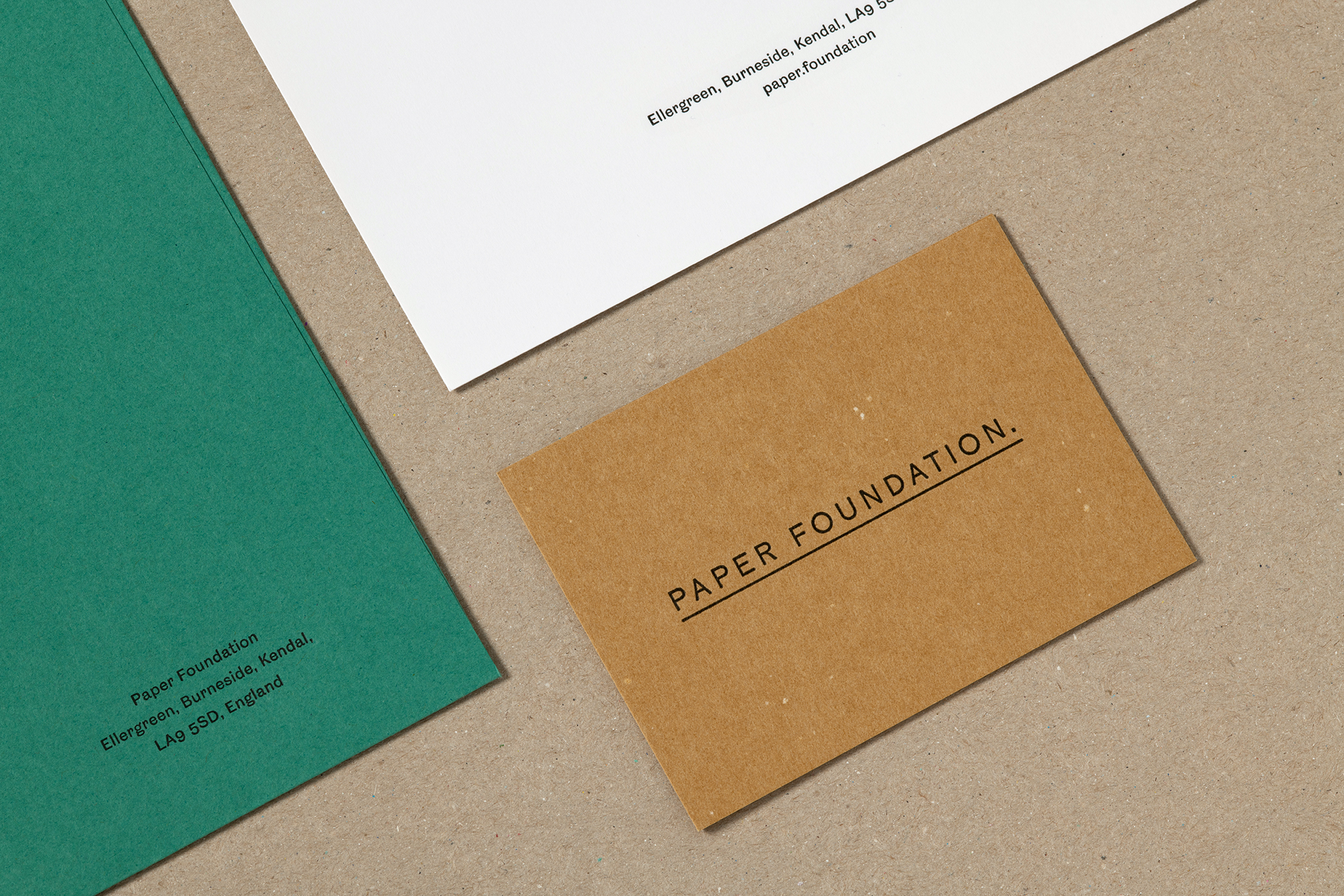Identity design (2020) for the Paper Foundation, an arts and heritage charitable organisation created to celebrate paper, founded by Mark Cropper (of the James Cropper paper mill). Atelier Dyakova’s identity for the Foundation, based in Burneside in England’s Lake District, lets the paper play a pivotal role: the logo is based on historical watermarks used by paper-makers to certify their production, while the all caps and underlined wordmark is based on a telegram envelope from the 1800s that Dyakova came across in the Foundation’s archive. Photography: Ed Park.