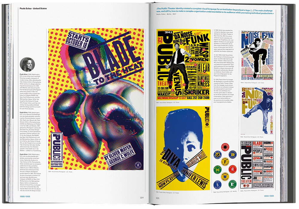 And yet, one has to ask, are these two monuments really what we need at this point in the stop-start evolution of graphic design history as a field of study? Organised by decade and year, the volumes have the bare minimum of text. Each book has a brief introduction and thereafter the featured designers and themes, all allotted a spread, receive summary paragraphs and biographies of around 100 words, in English, German and French, putting even more pressure on space. These are coffee-table books par excellence and they are designed to blow away the competition, to suck the air out of the room. Why buy Meggs or Eskilson or Drucker and McVarish for a teenager wondering about studying graphic design at university, or for the design studio library, or for your personal viewing pleasure, when these far more extensively illustrated round-ups look like greater fun to flip through?