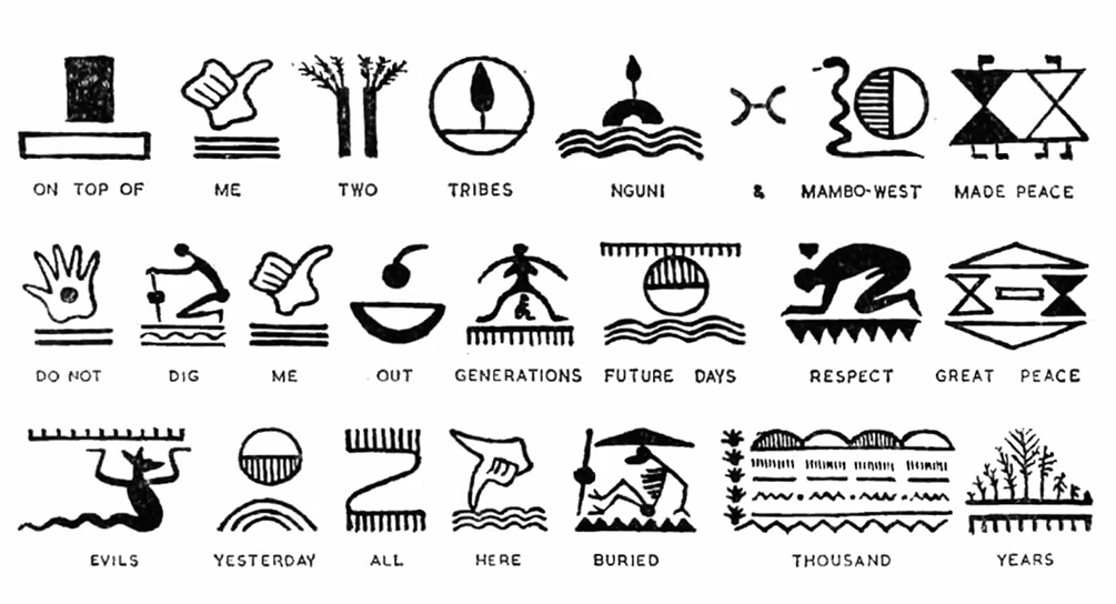 Photograph of a Ghanaian tribal elder wearing Adinkra cloth, from Fungi Dube’s presentation about Adinkra symbols and their meanings. Top. Bantu (or Nguni) symbol writing presented in the ‘Typographics 21’ talk by Taurai Valerie Mtake of TaVaTake Designs (Zimbabwe): ‘Each symbol represents not a single character or letter, but a whole word or complete idea.’